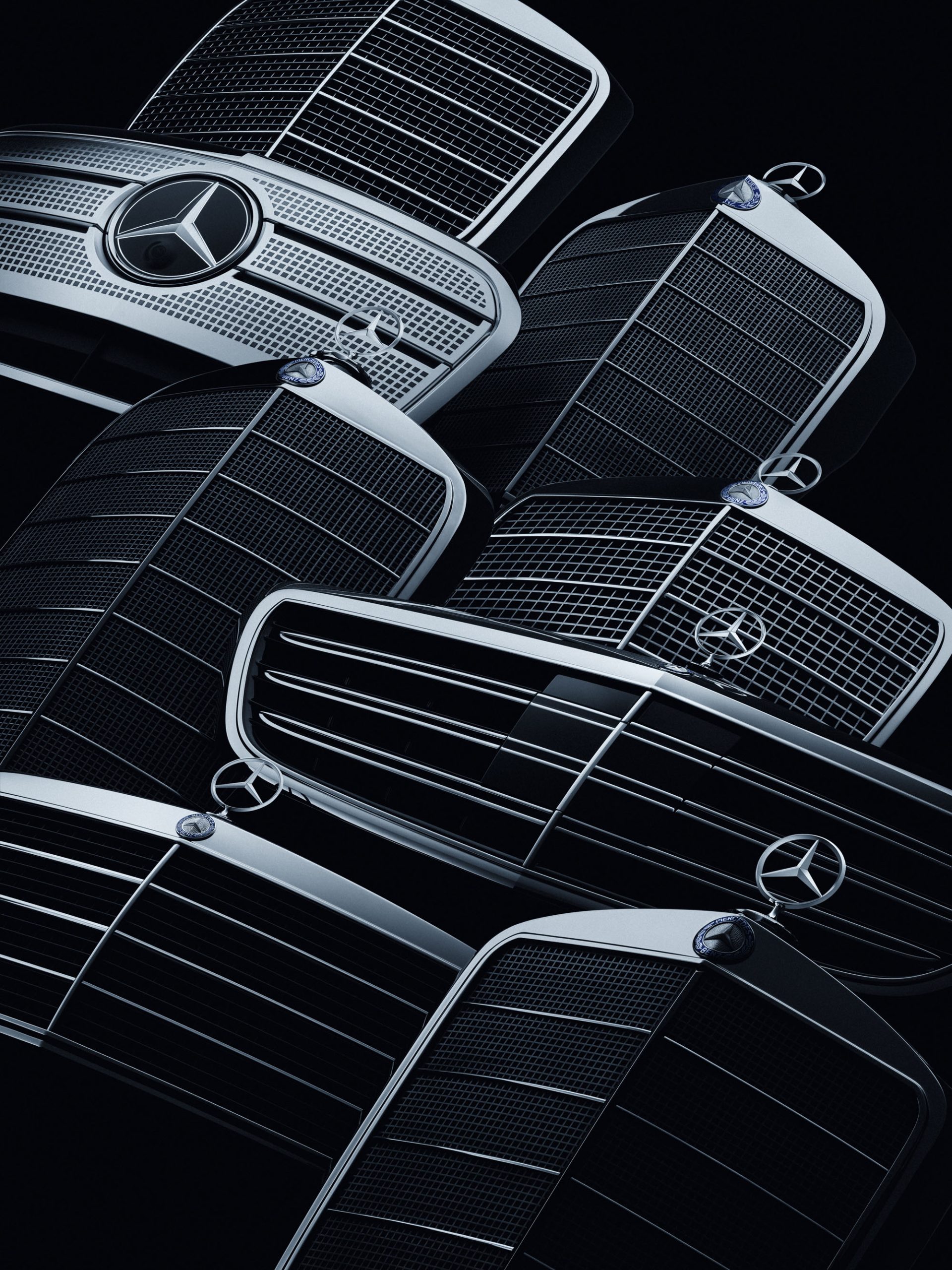 Ikonisches Design: Mercedes-Benz Kühlergrills aus verschiedenen Epochen. Studioaufnahme aus dem Jahr 2025.