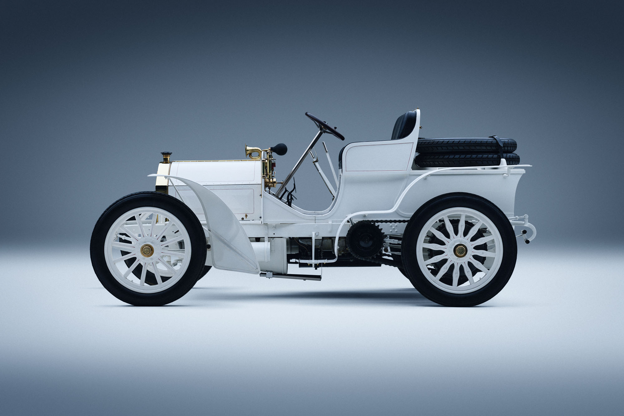 Mercedes-Simplex 40 hp, production period 1902 to 1903. Vehicle from 1902. Studio shot from the left, taken in 2025.