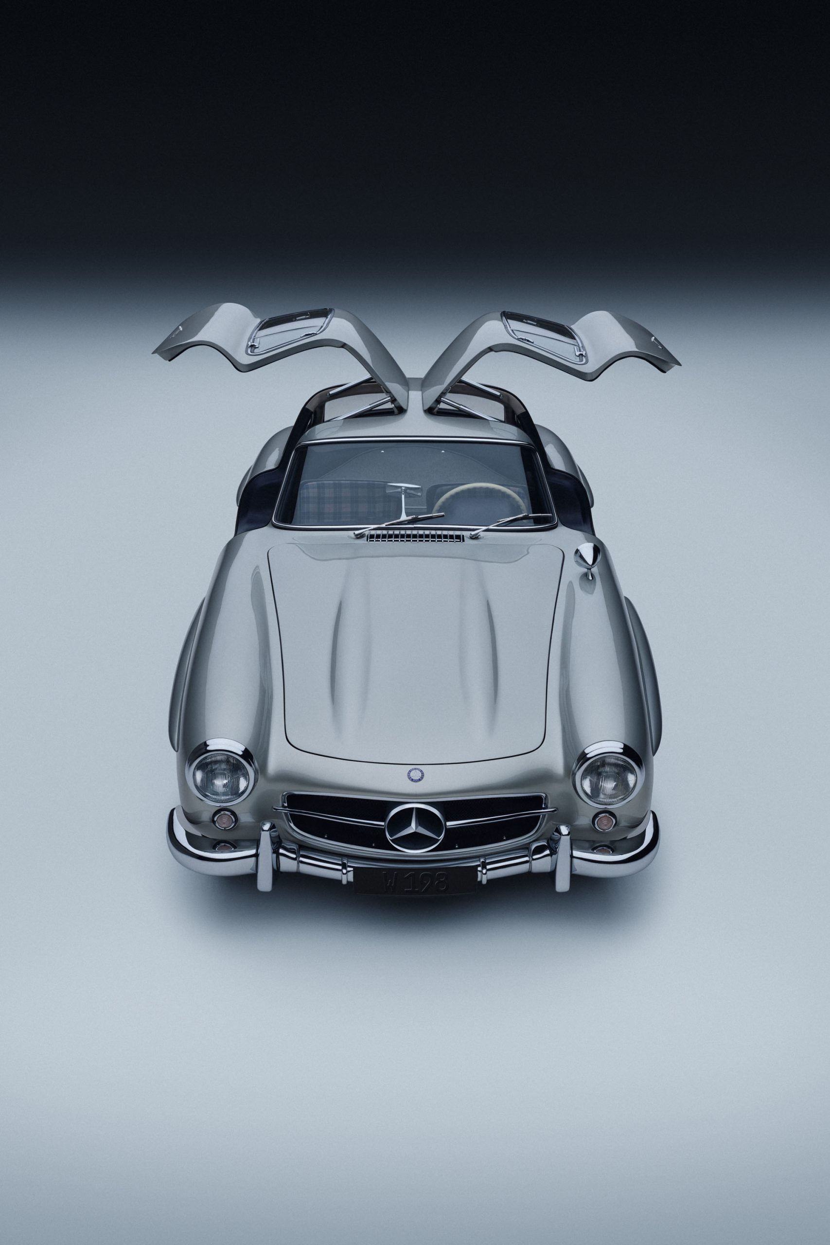 Mercedes-Benz 300 SL “Gullwing” (W 198), production period 1954 to 1957. Vehicle from 1955. Studio shot from the front with gullwing doors open, taken in 2025.