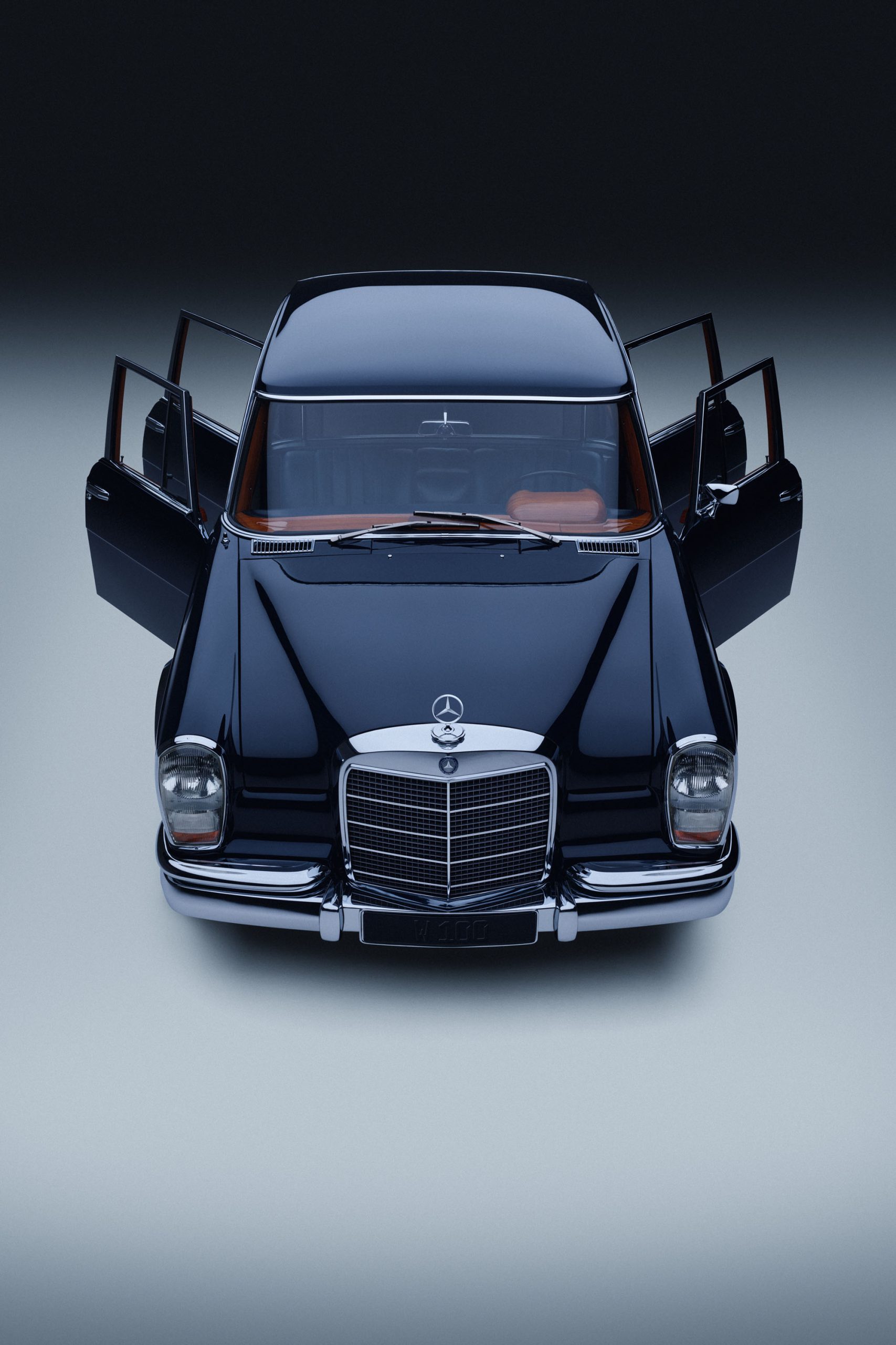 Mercedes-Benz 600 “Grand Mercedes” from the 100 series, produced from 1963 to 1981. Saloon with short wheelbase from 1963. Studio shot from the front with open doors, taken in 2025.