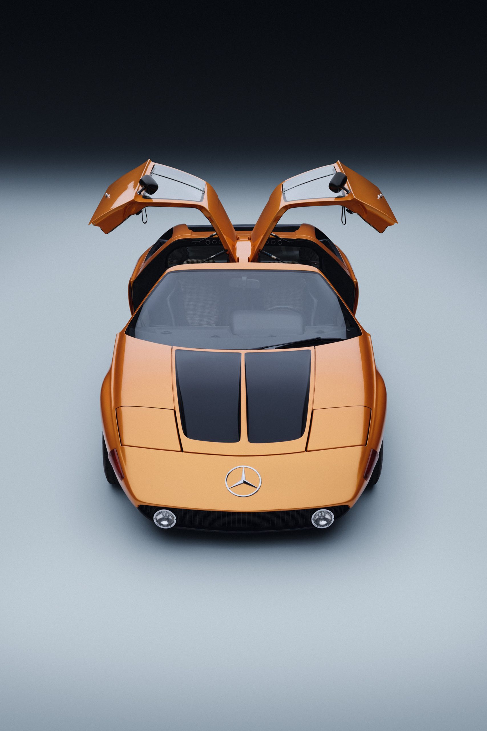 Mercedes-Benz C 111-II. Experimental vehicle from 1970. Studio shot from the front with gullwing doors open, taken in 2025.
