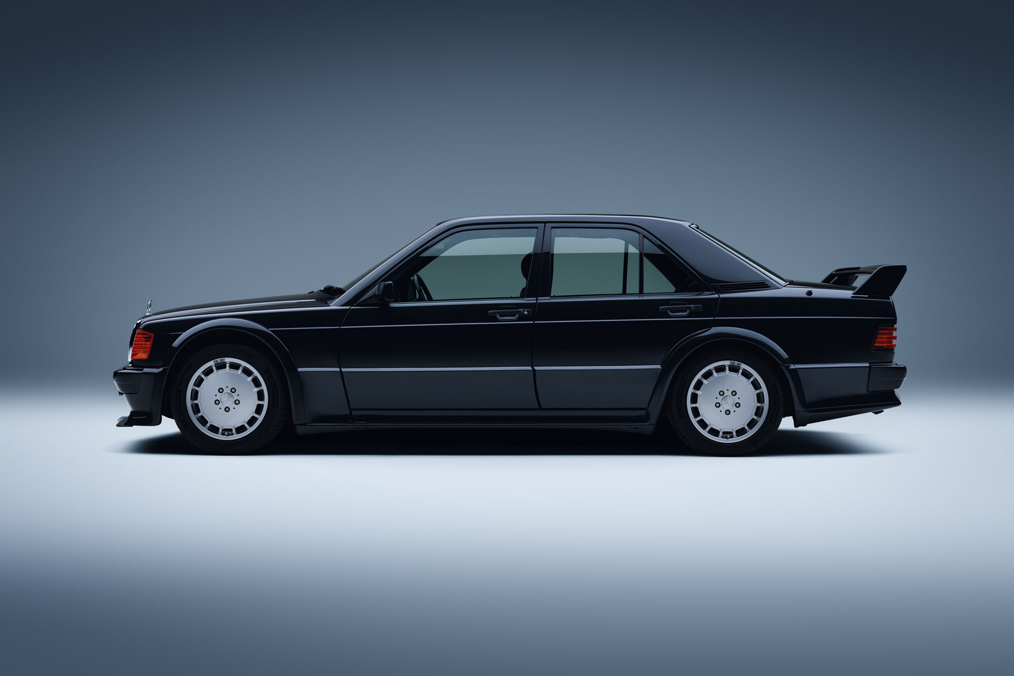 Mercedes-Benz 190 E 2.5-16 Evolution from 1989 (201 series, production period 1982 to 1993). Studio shot from the left, taken in 2025.
