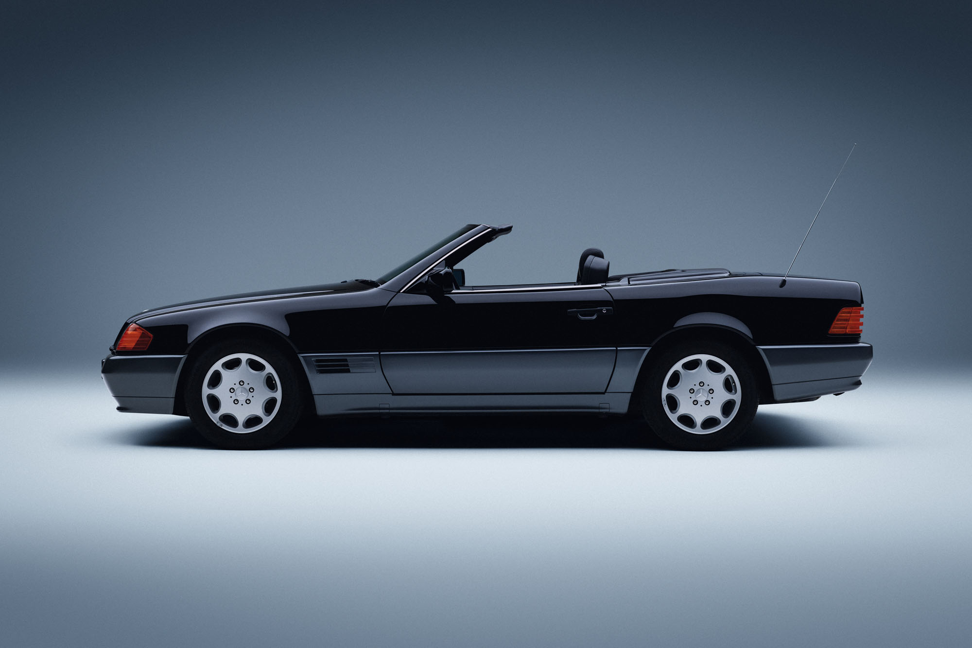 Mercedes-Benz 300 SL from 1992 (129 series, production period 1989 to 2001). Studio shot from the left, taken in 2025.