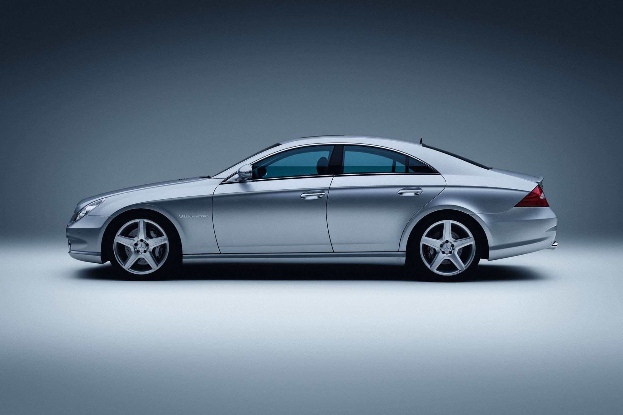 Mercedes-Benz CLS 55 AMG from 2005 (219 series, production period 2004 to 2010). Studio shot from the left, taken in 2025.