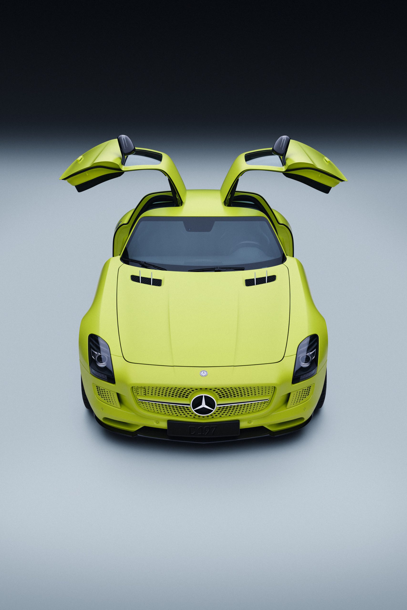 Mercedes-Benz SLS AMG Coupé from 2013 (197 series, production period from 2010 to 2014). Studio shot from the front with gullwing doors open, taken in 2025.