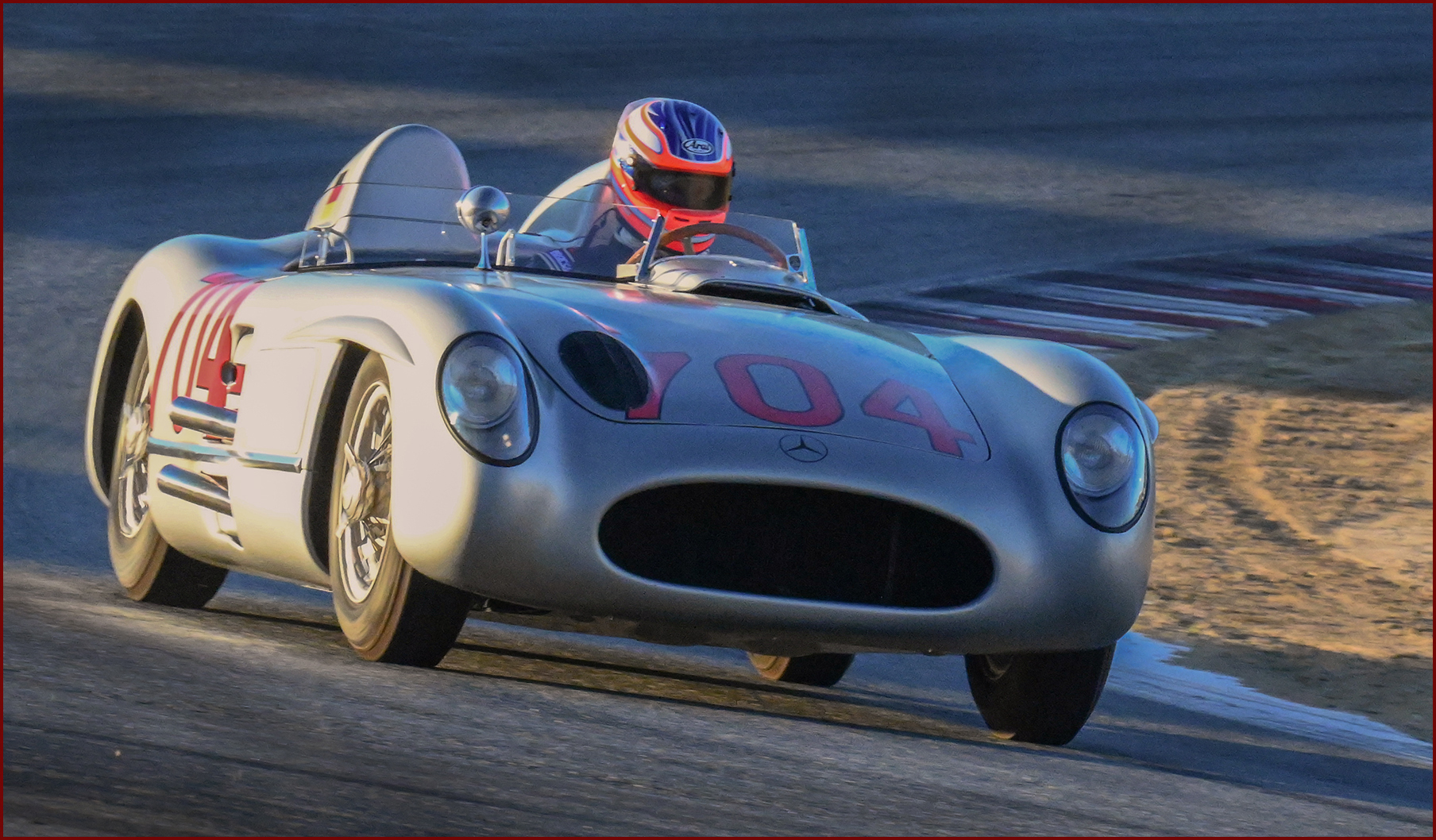 Derik Hill takes the Mercedes 300SLR through Laguna’s turn five late Saturday afternoon. ©2021 Dennis Gray