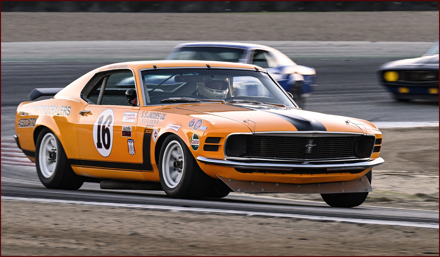 Jim Hagues 1970 Boss 302 Trans-Am Mustang leads out of Laguna’s turn two.©2021 Dennis Gray
