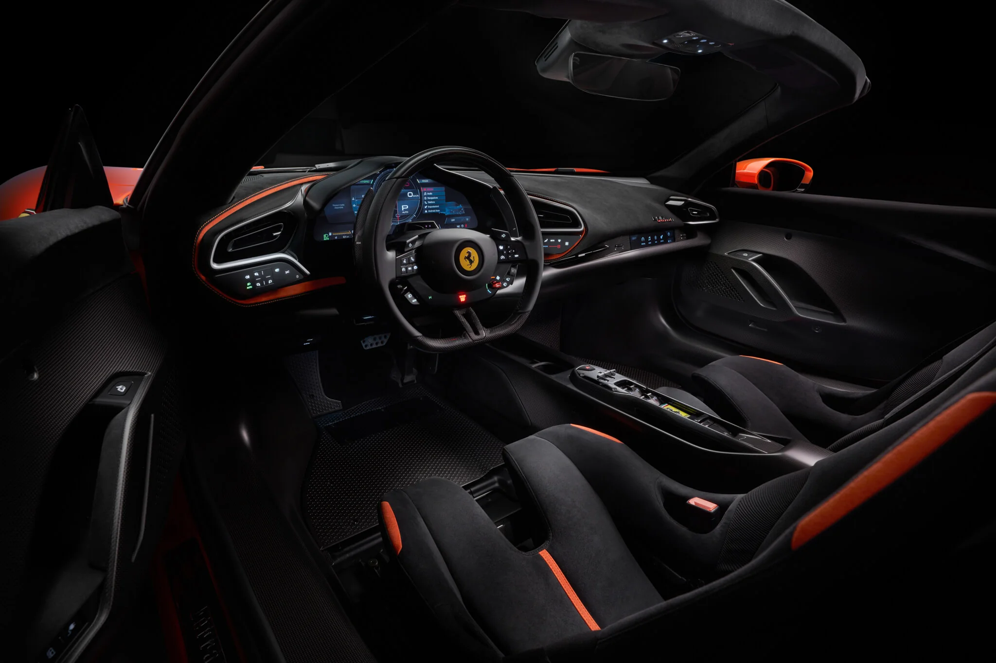 • Power and response: An evolved 3.0-liter, 120-degree V6 twin-turbo works with a single e-motor and a 7.45 kWh battery. The V6 gains 36 bhp versus the GTB thanks to race-car mapping and boost tweaks. The e-motor contributes 177 bhp, for a combined 868 bhp and 557 lb-ft of torque.