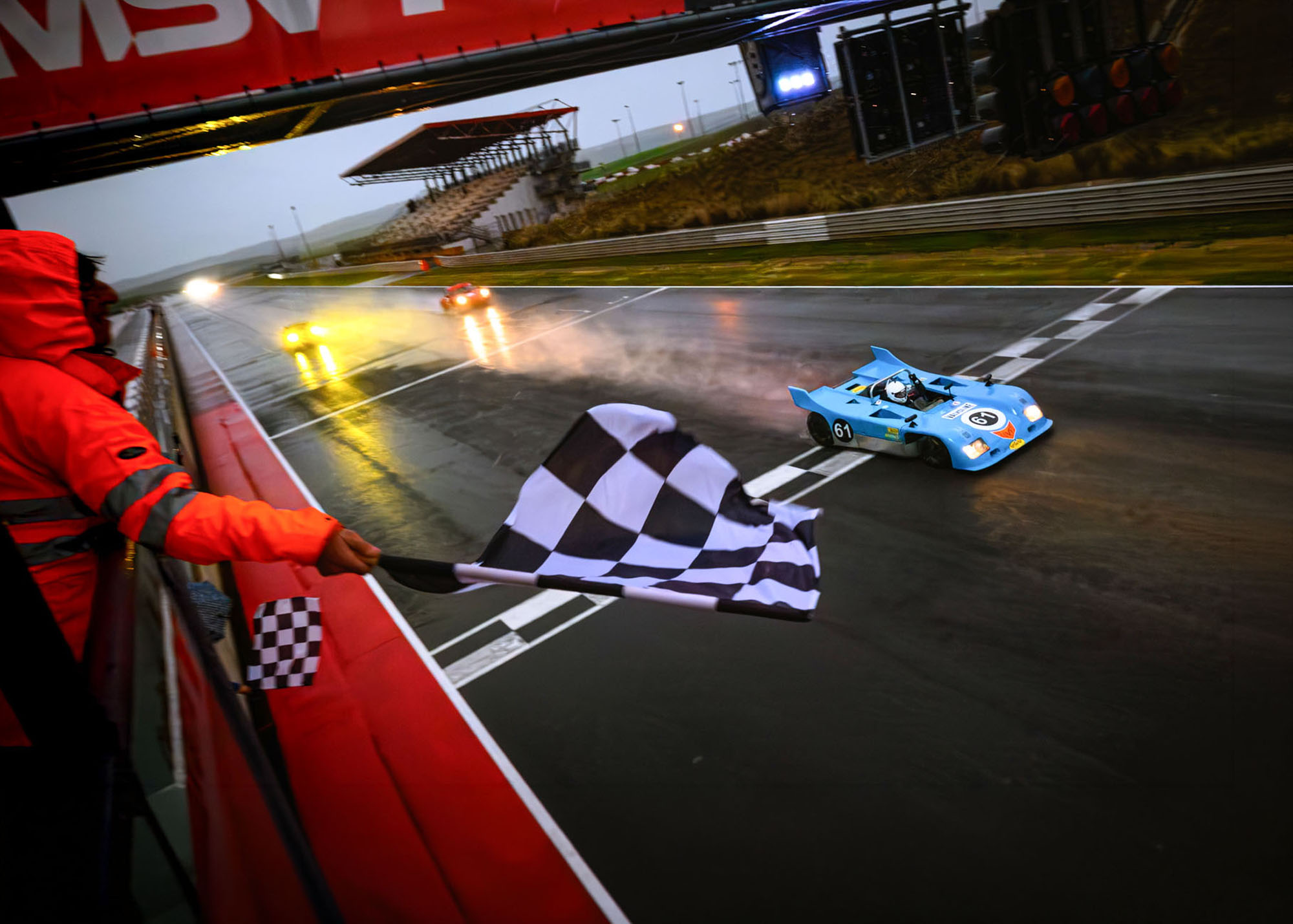 However, the race took a dramatic turn in the final hour as rain swept across the circuit. Mechanical reliability, rather than driver error, proved decisive. Moisture infiltrated the distributor of the leading car, causing it to fall to third place. The KMW Porsche capitalized, reclaiming the lead just as another safety car was deployed following the retirement of the #20 Porsche 944. A final-lap restart failed to alter the order.