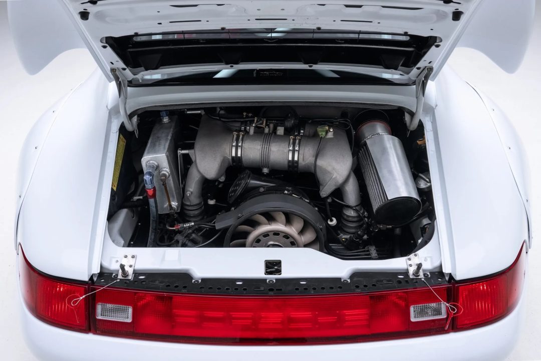 Power comes from an air-cooled 3.8-liter M64/75 flat-six with individual throttle bodies, producing around 350 horsepower, paired with a six-speed manual transmission driving the rear wheels. Additional upgrades include air conditioning, three-point seatbelts, a fire extinguisher, and an optional 100-liter fuel tank is housed in the front trunk.