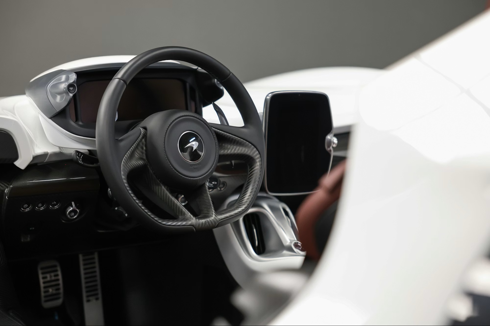 Features include LED lighting, parking sensors, a reversing camera, carbon-backed bucket seats, a digital display, touchscreen infotainment with navigation and Bluetooth, cruise control, nose lift, switchable aero, and a McLaren audio system.