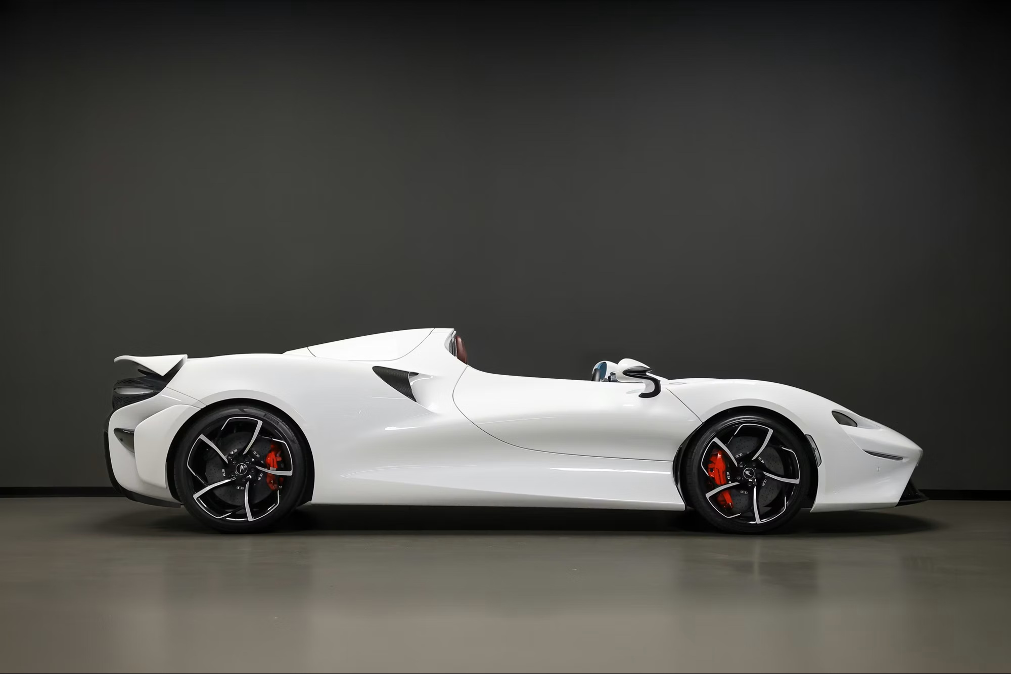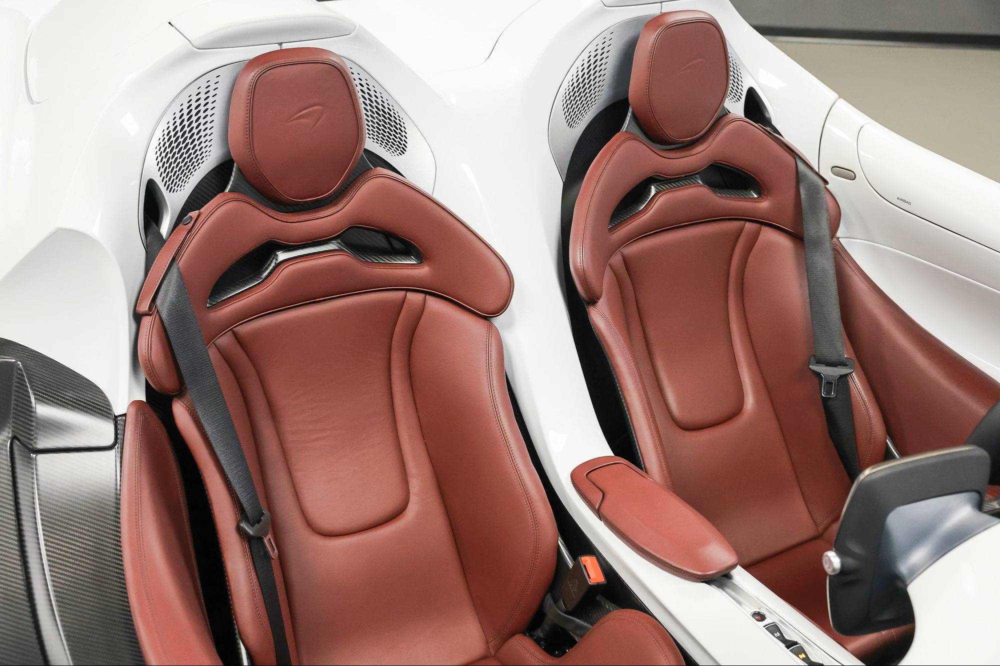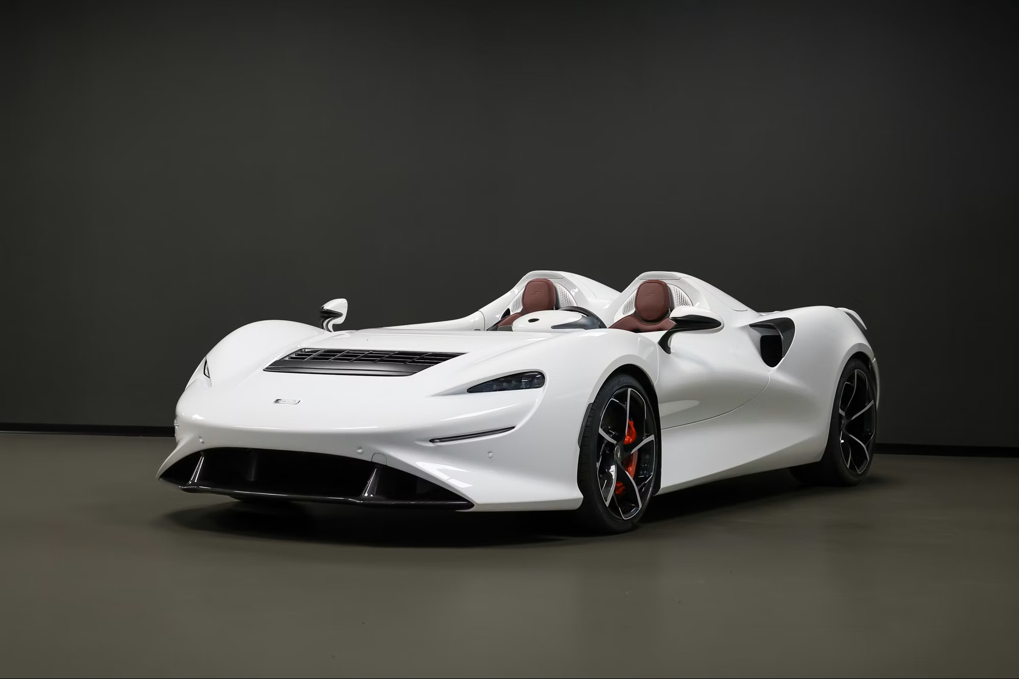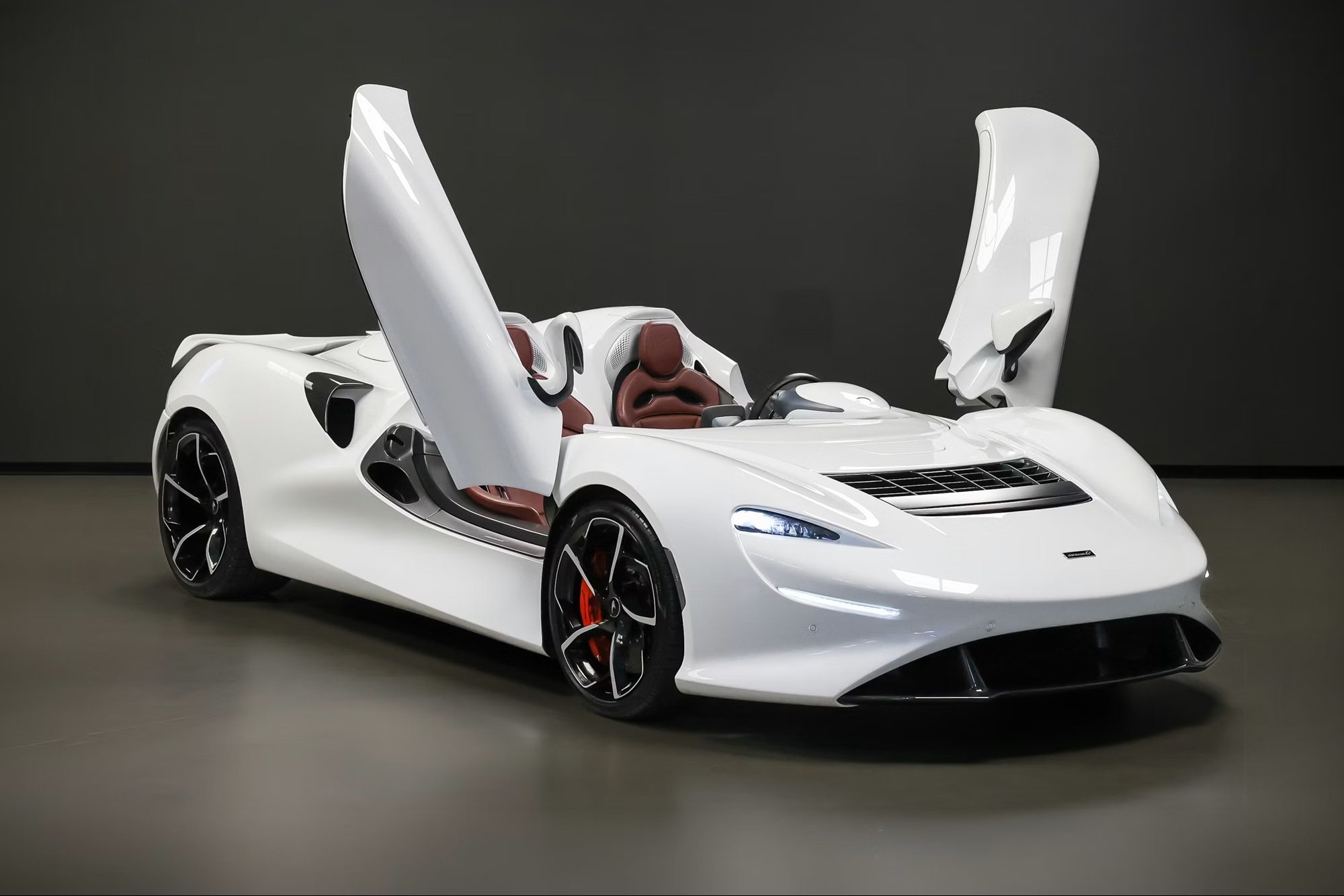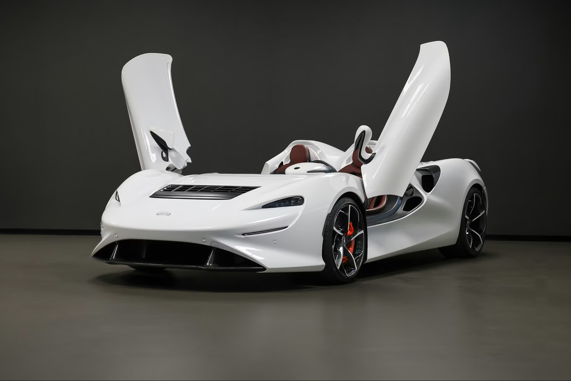 Inside, it’s trimmed in Bordeaux semi-aniline leather with embossed McLaren logos, satin carbon-fibre accents, galvanic grey paddles, black seatbelts, branded mats, body-colour inserts, and satin-silver and brushed aluminium trim. It rides on gloss-black, diamond-cut super-lightweight forged wheels, paired with red McLaren brake calipers and Pirelli P Zero tyres.