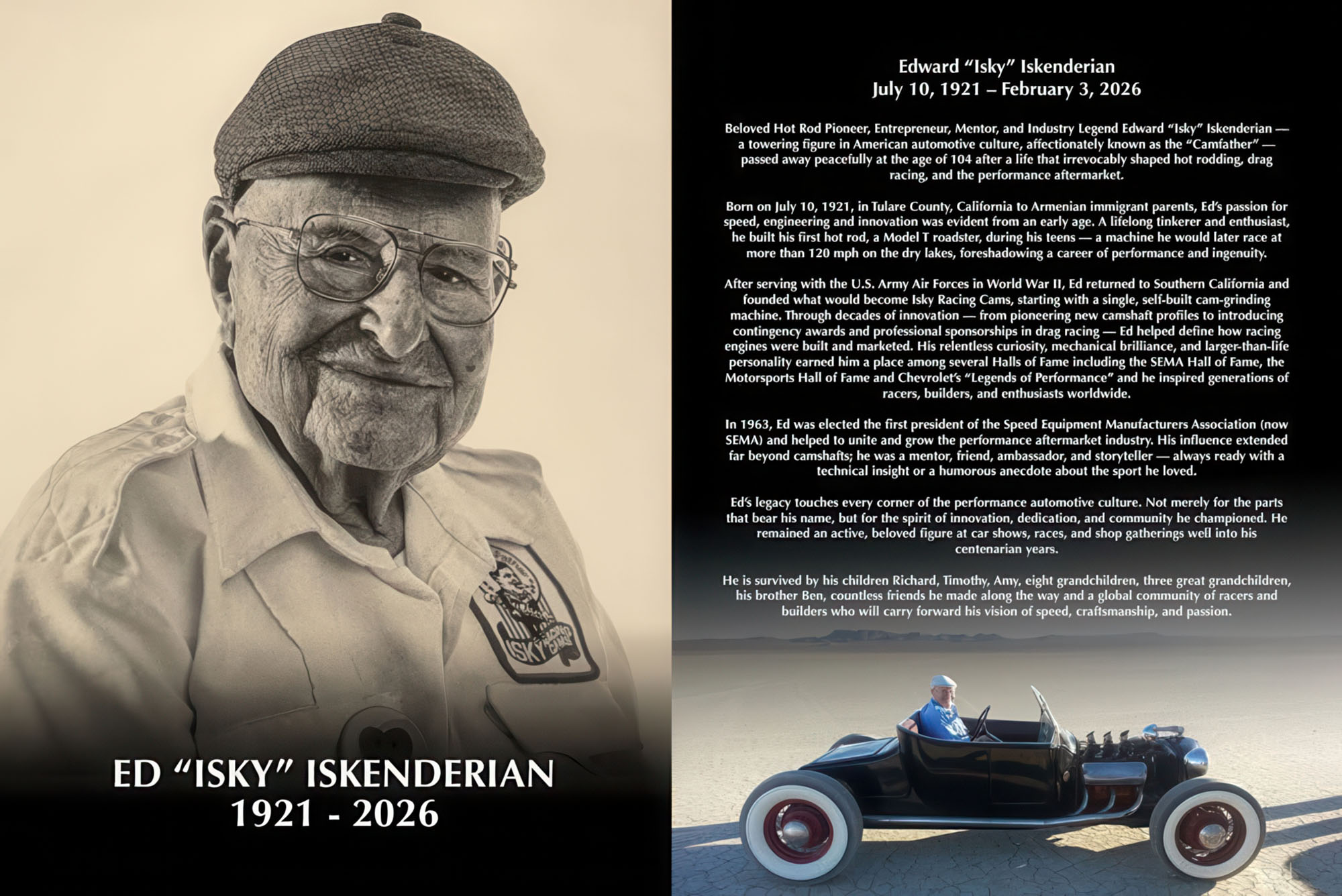 Ed the “CamFather” ‘Isky’ Iskenderian, who was a legend among racers worldwide and last of the original hot rod heroes, has passed away at 104 on February 4th 2026. Iskys story goes way back to the 1940s when he went lake racing at Muroc Dry Lake (Rogers Lake) at Edwards Air Force Base in California, and then enlisted in the US Army Air Corps during WWII and flew supply missions in the Pacific with the US Air Force. Isky worked as an aircraft mechanic and crew chief, so his wartime experience expanded his understanding of engineering and broadened his technical awareness, which would expand his knowledge of camshaft design and high-power racing engines.