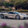 The cabin features power-adjustable sport seats upholstered in silver leather. Interior amenities include automatic climate control, cruise control, a Bose sound system, and a cassette stereo linked to a six-disc CD changer. The stainless-steel door sill plates are stamped with the car’s serial number.