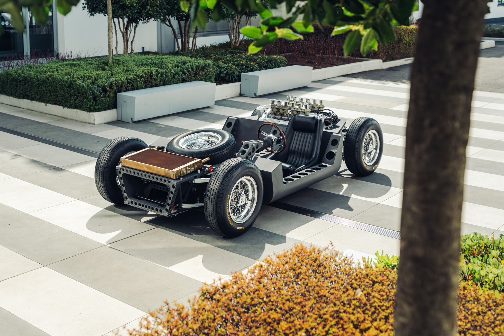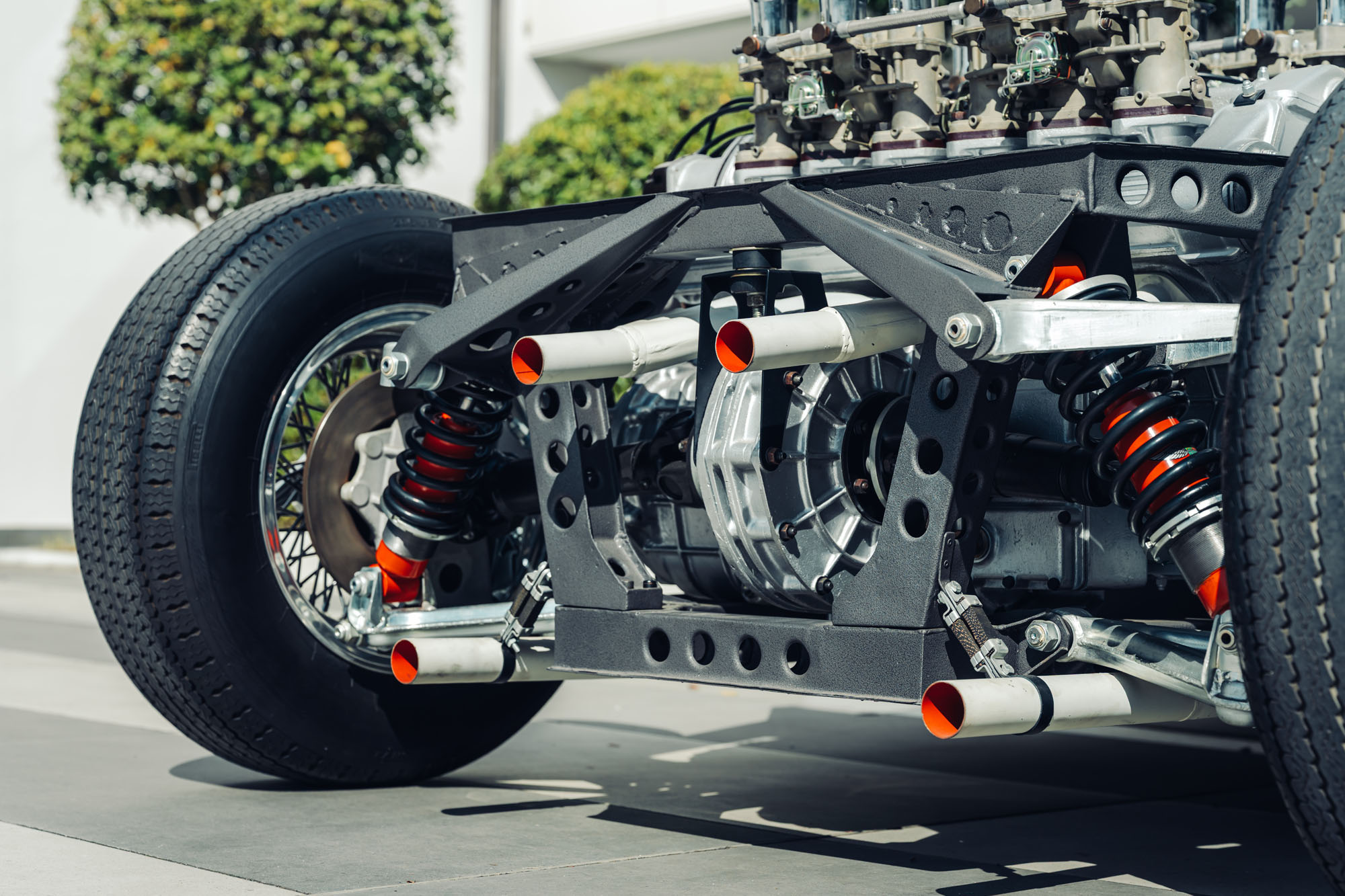 The display opens with the original Miura chassis, first shown at the Turin Motor Show in 1965. Presented before the completed car itself, the matte-black tubular structure—featuring the V12 mounted transversely behind the cockpit—immediately captured attention from both the public and industry insiders. Weighing just 120 kilograms, the lightweight steel chassis incorporated thin walls and numerous lightening holes, introducing a radical layout that would redefine the architecture of high-performance road cars.