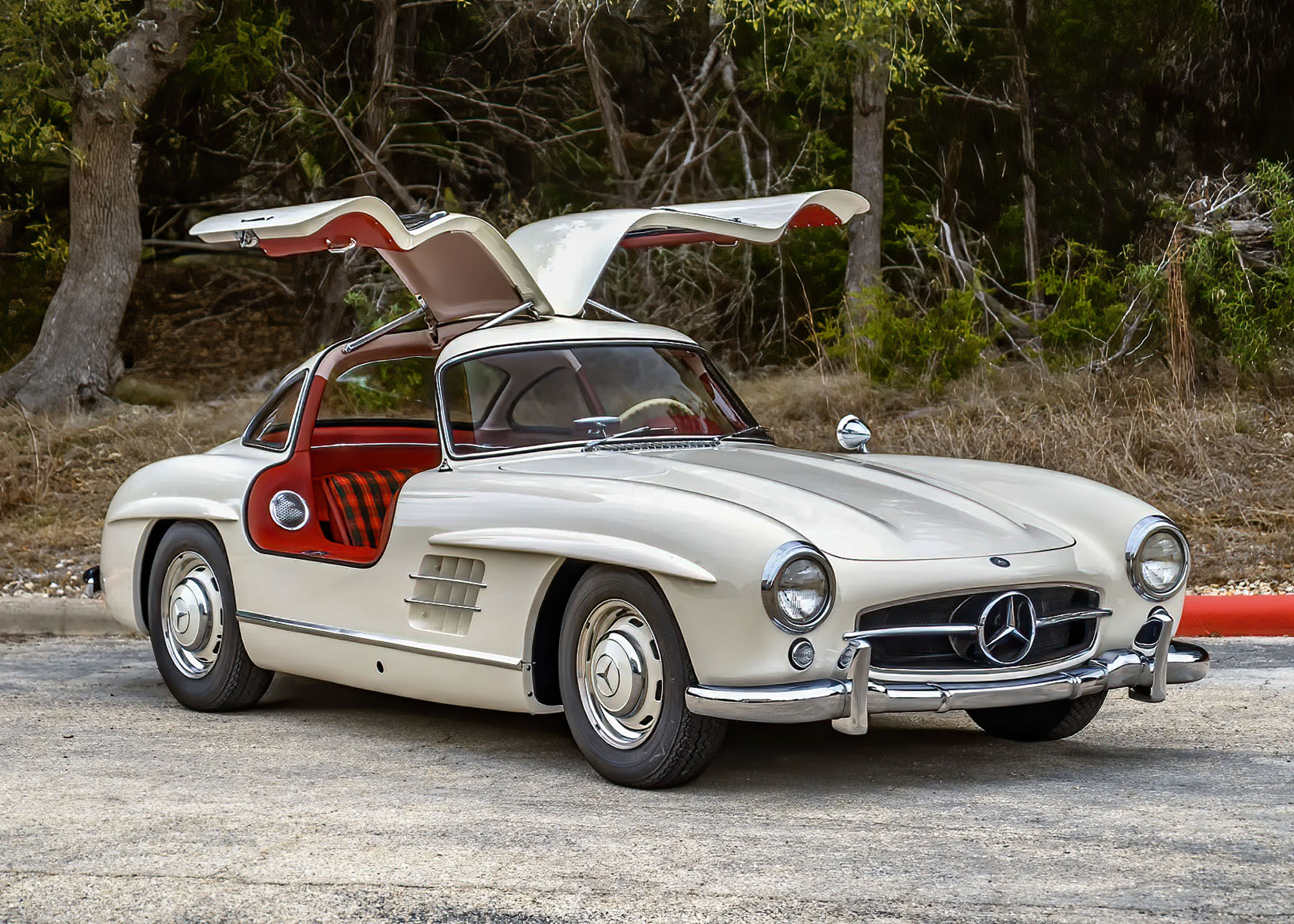 Development of the 300SL was spurred by US importer Max Hoffman’s suggestion that Mercedes produce a sports car appealing to the American market. The model inherited several design elements from the company’s W194 sports racers, including upward-opening doors made necessary by a high-sill lightweight tubular space frame. Introduced at the 1954 International Motor Sports Show in New York, the production version of the 300SL utilized steel bodywork with aluminum panels for the hood, trunk lid, door skins, rocker panels, and floorboards.