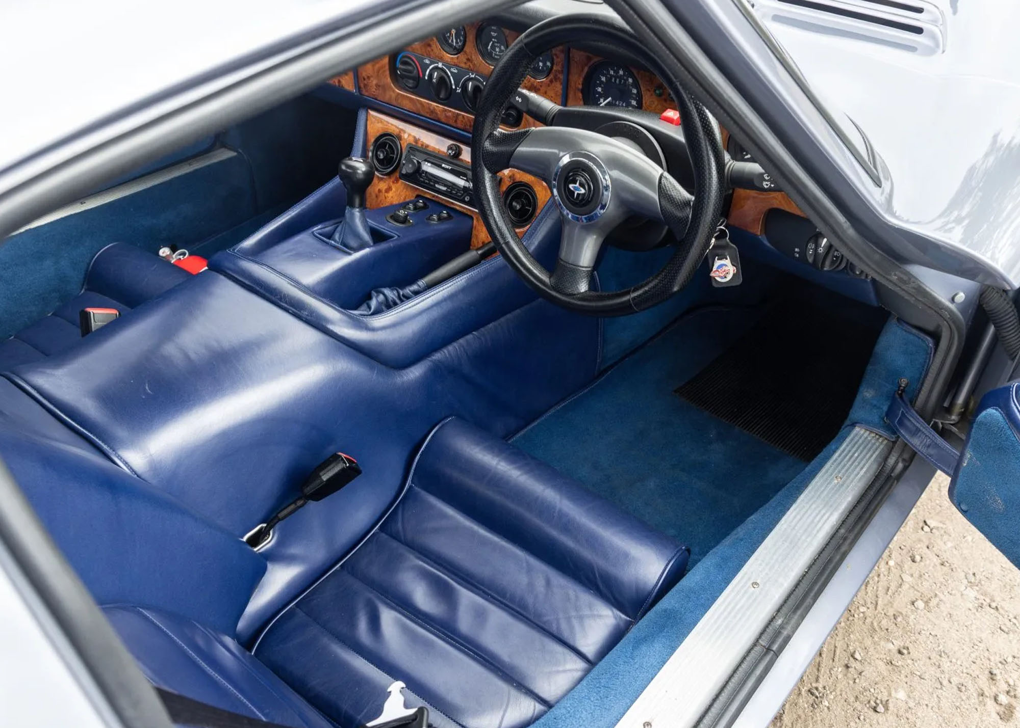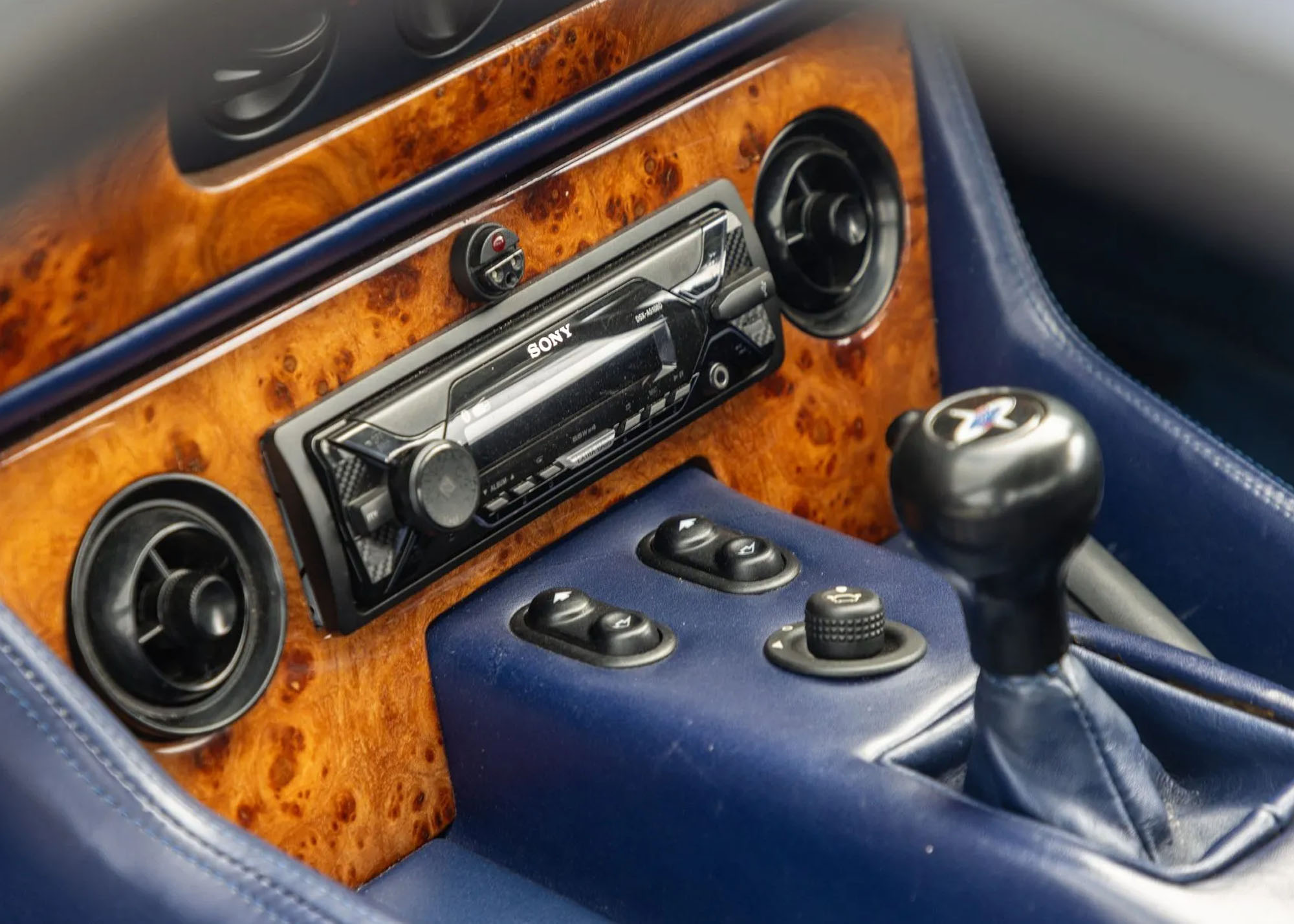 Inside, the right-hand-drive cabin presents Ink Blue leather, Jonio Blue carpeting, and Elm burl veneer. A Sony digital receiver and Kenwood speakers provide modern audio, while recent work on the air conditioning system improves usability.