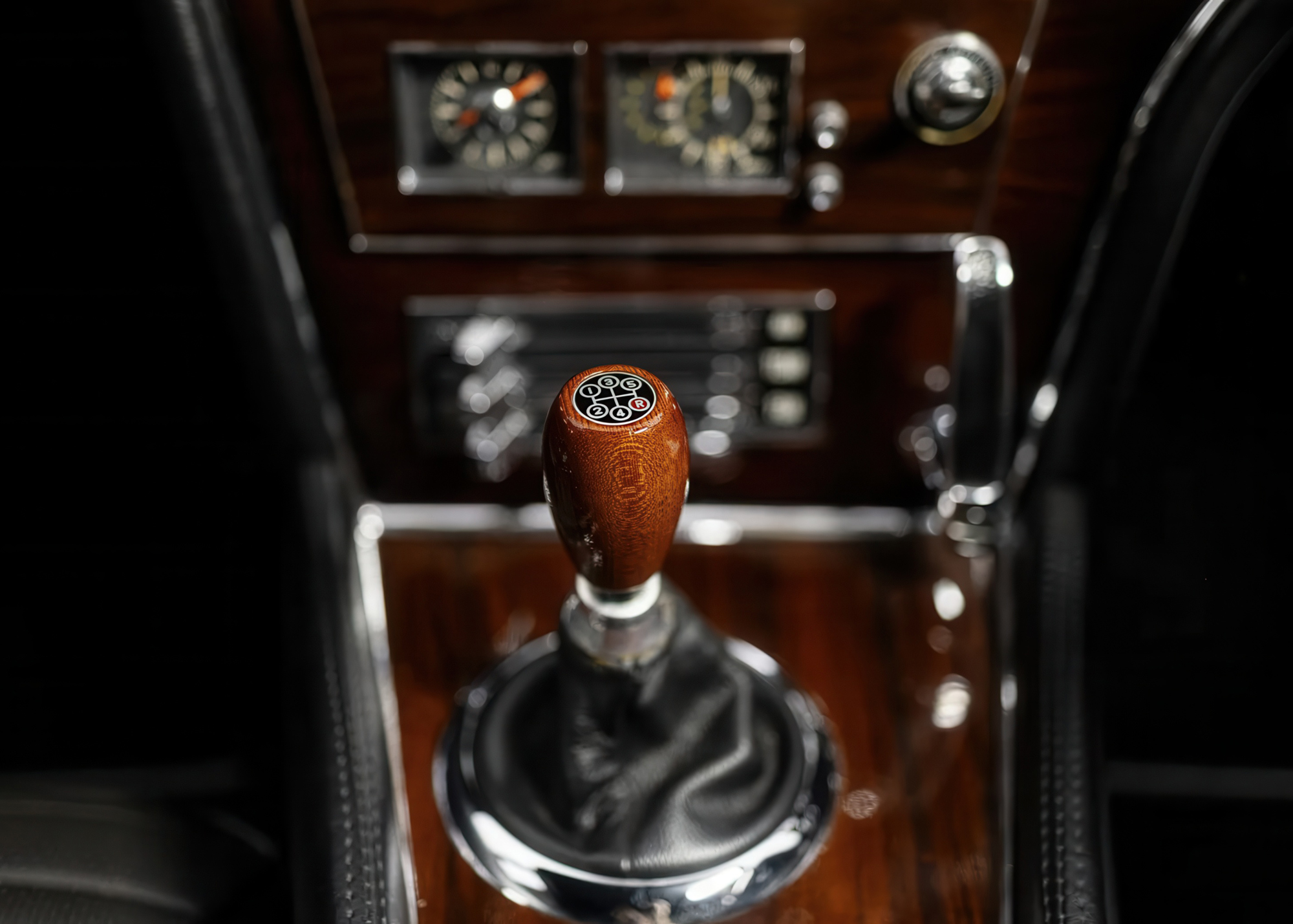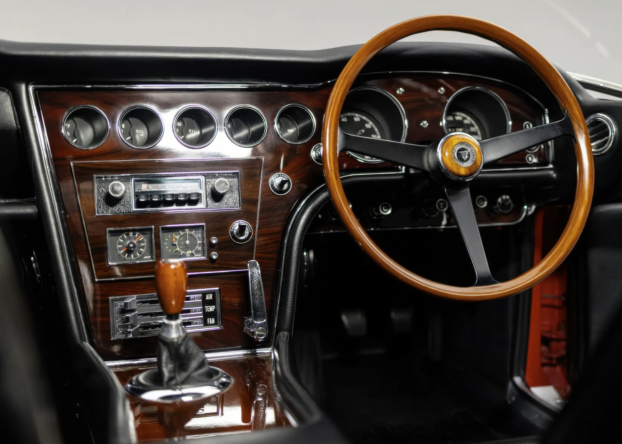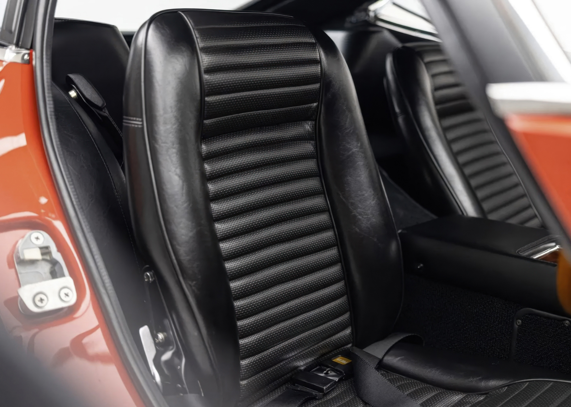 The right-hand-drive cockpit is trimmed in black vinyl with knitted seat inserts, while color-matched carpeting covers the floors and rear cargo area. Wood veneer trim accents the dash and center console. Additional features include a wooden shift knob, an L-shaped handbrake lever protruding through the dash, black shoulder belts, a lockable glovebox, and a storage cubby behind the seats.