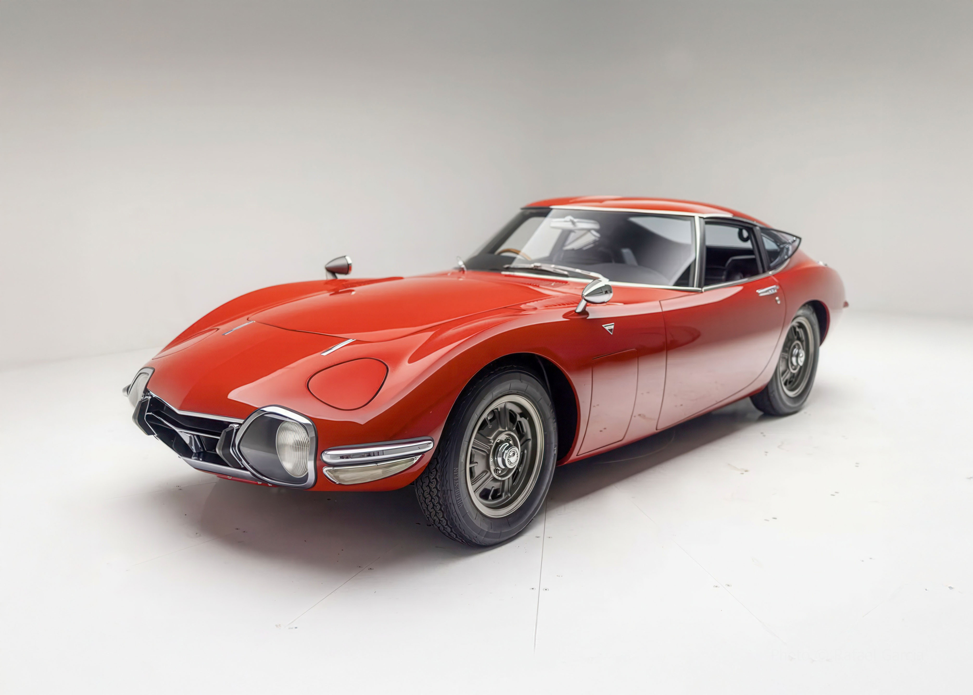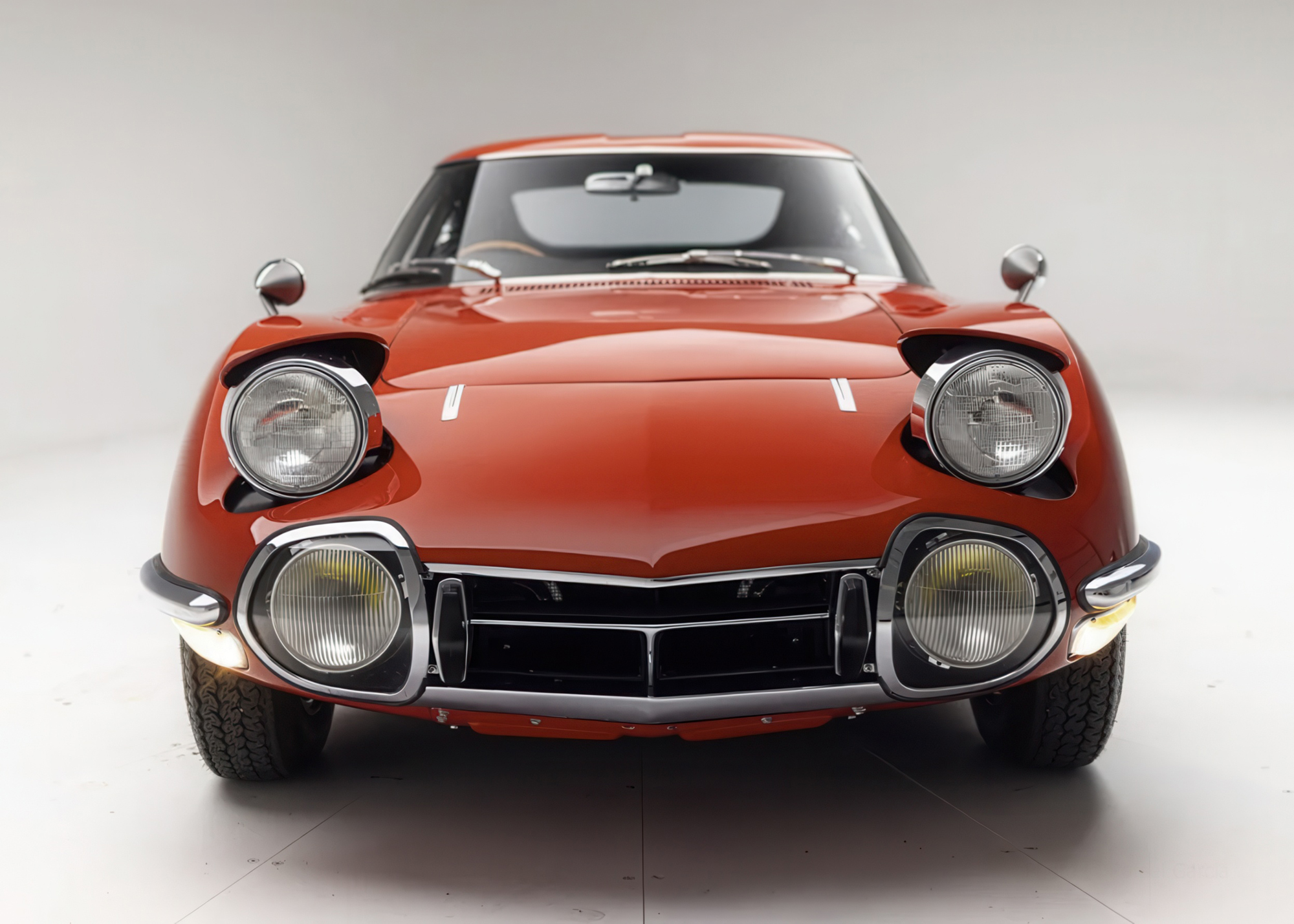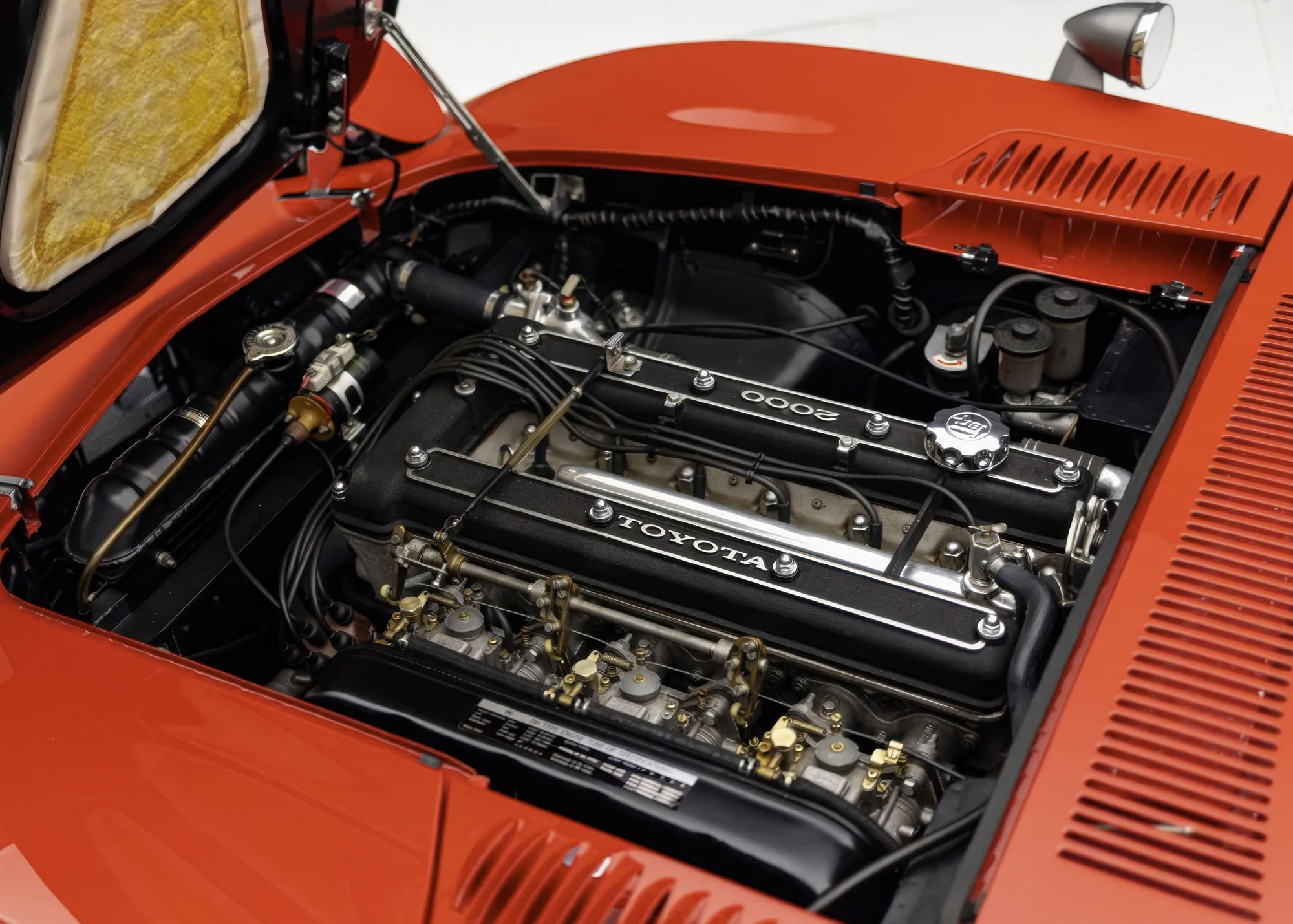 Developed collaboratively by Toyota and Yamaha, the 2000GT debuted as a prototype at the 1965 Tokyo Motor Show and entered production in February 1967. Construction was carried out by hand at Yamaha’s Itawa factory and incorporated bodywork styled by Toyota’s Satoru Nozaki. With its contoured roof standing under 46” at its highest point, the 2000GT also featured pop-up headlights, driving lamps faired into the nose, bullet-style fender mirrors, and louvered panels flanking the hood.