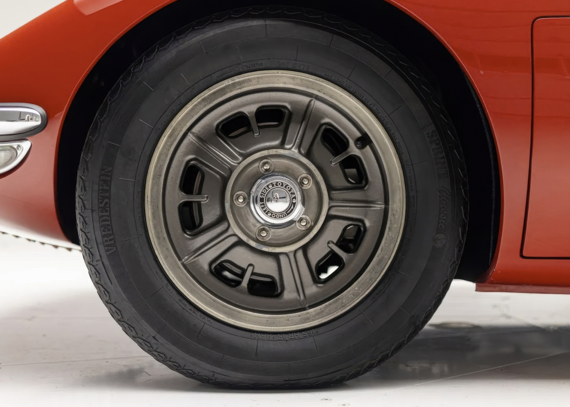 Bright knock-offs secure magnesium alloy wheels and wear 165HR15 Vredestein Sprint Classic tires, while a matching spare in the rear cargo compartment wears Dunlop rubber. A 2015 brake system refreshment by Classic Performance Engineering in Bicester, UK, included rebuilds of the calipers, reconditioning of the rotors, and the replacement of the servo. Replacement Eibach springs and Öhlins shock absorbers were also fitted in 2015, and the steering rack was rebuilt.