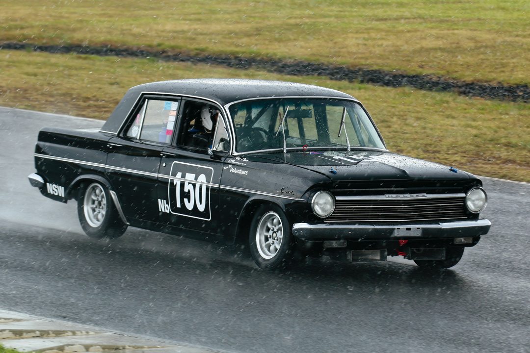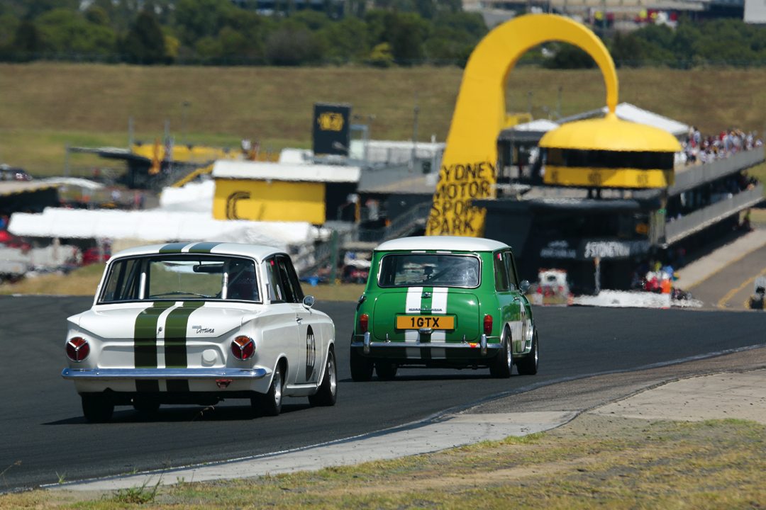 David Roberts (Mini Cooper S) and Brian Titheradge (Ford Cortina) head down the straight at Sydney Motorsport Park. Photo: Steve Oom
