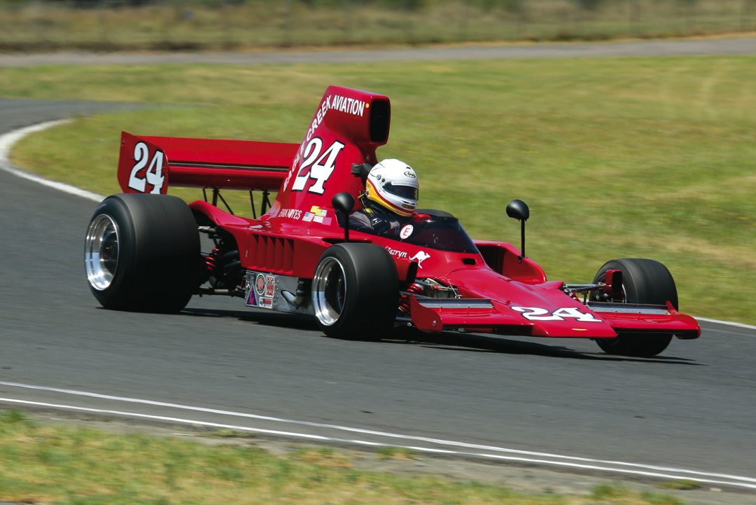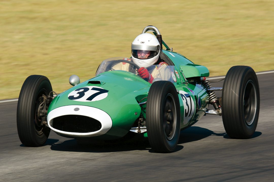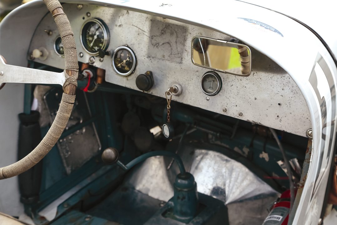 Rope-wrapped steering wheel gives driver control leverage, basic gauges adorn simple aluminum dashboard and shift lever for Ford gearbox falls readily to hand. Note rear-view mirror.Photo: Sean Smith