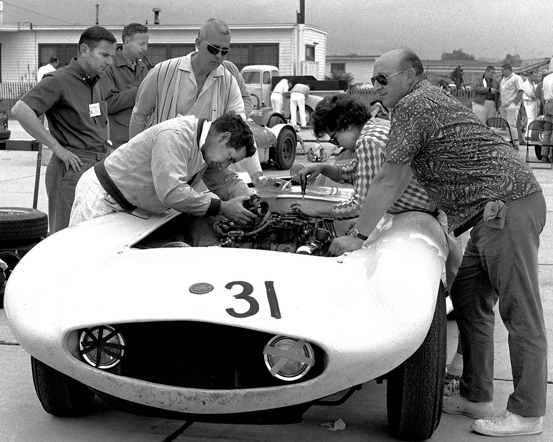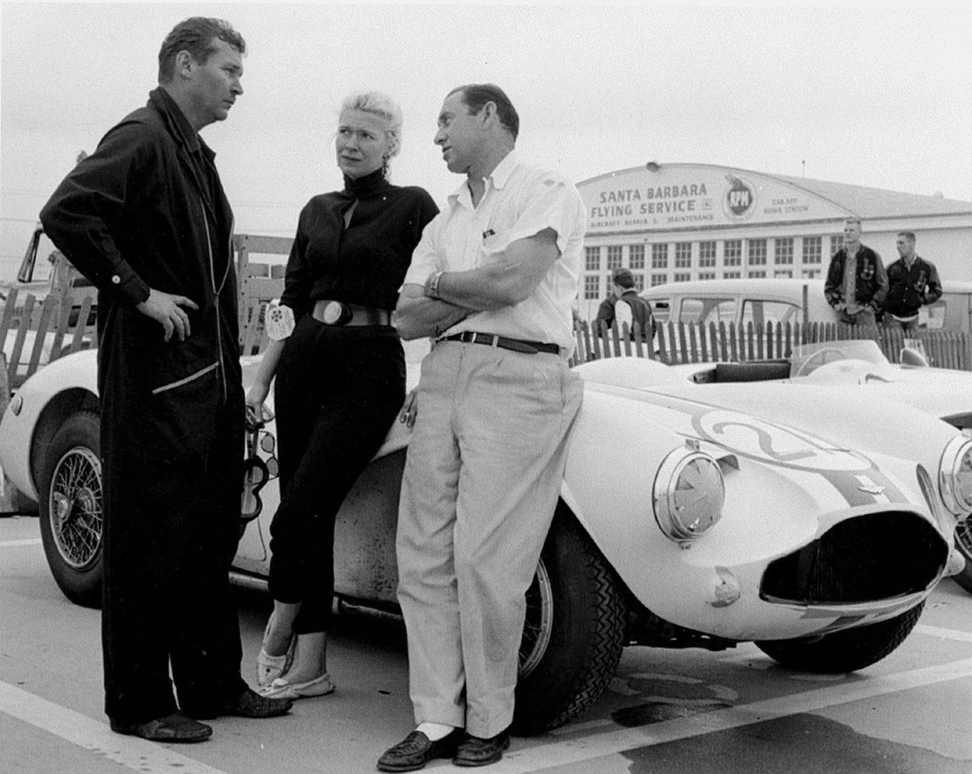 Bob Drake (left) campaigned Astons for wealthy-sportsman Joe Lubin (right) during the late fifties on the West Coast. DrakeÕs wife at the time, Mary Davis (center) usually won the ladiesÕ races in the same car. Photo: Art Evans