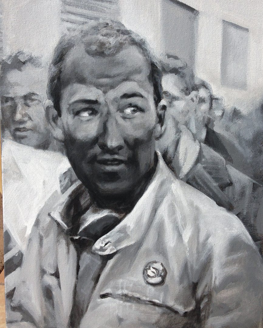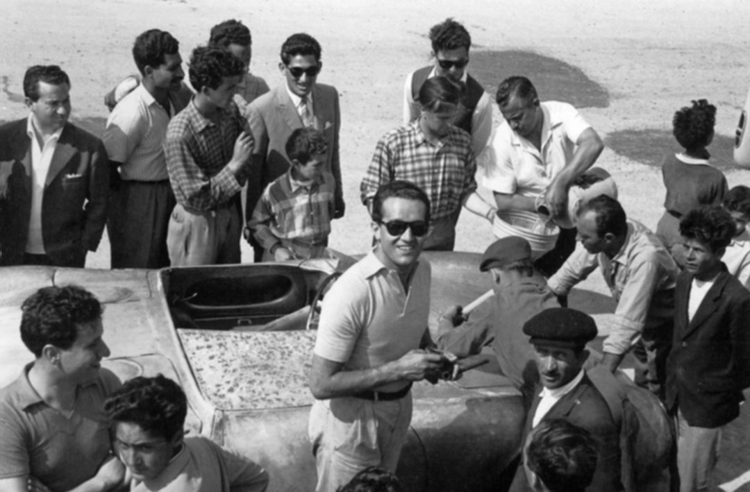 Umberto Maglioli stands beside his Porsche 550A and looks up from the pits during a break in open practice for the 1955 Targa Florio. The car arrived in Sicily with a bare metal body that was painted white before the race. Photo: Porsche