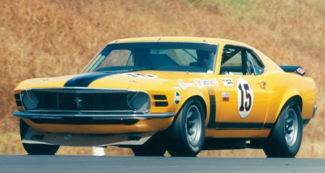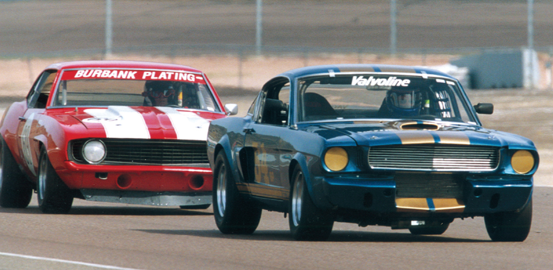 The Shelby GT350 of Jim Click leads the Camaro of Bob Scheer.