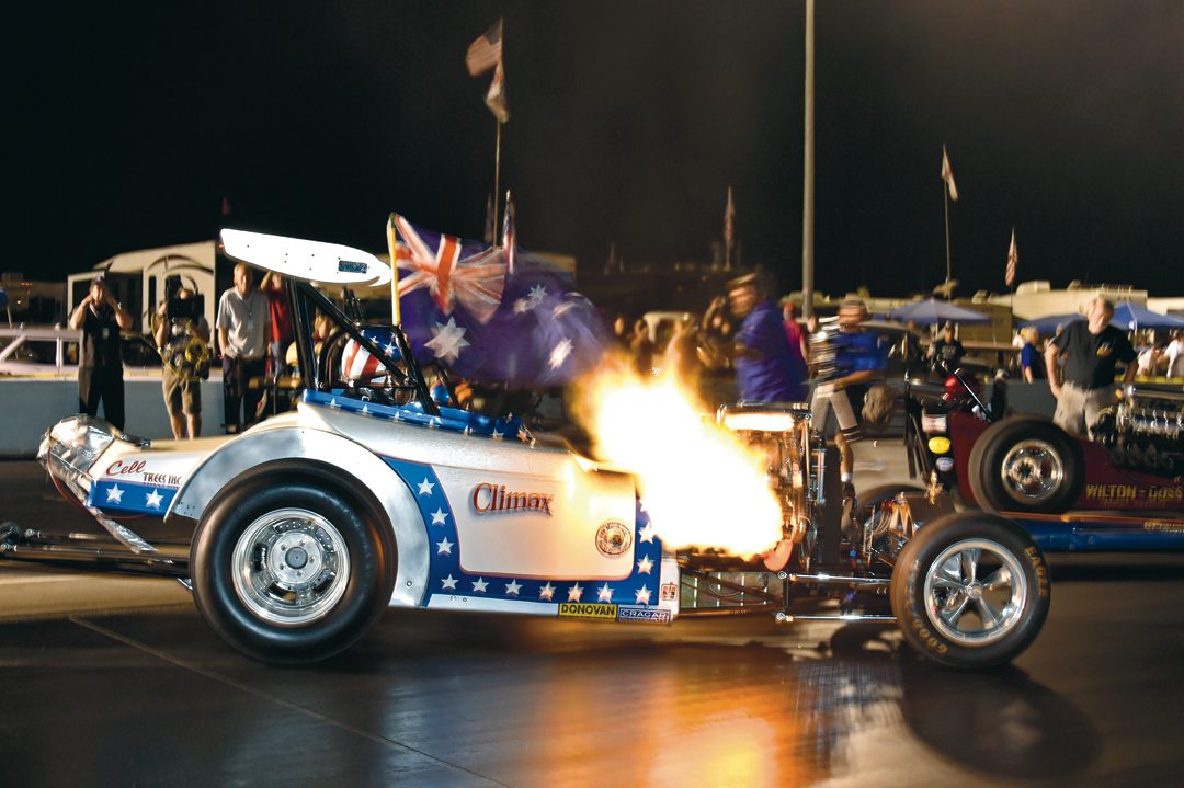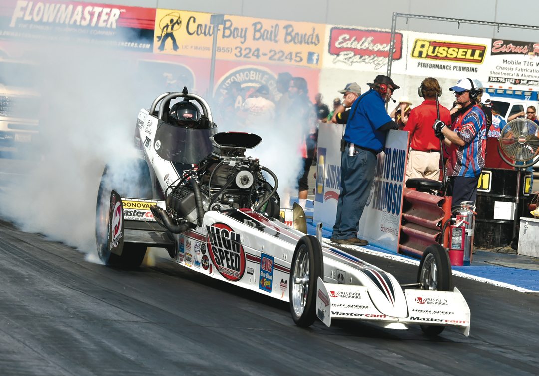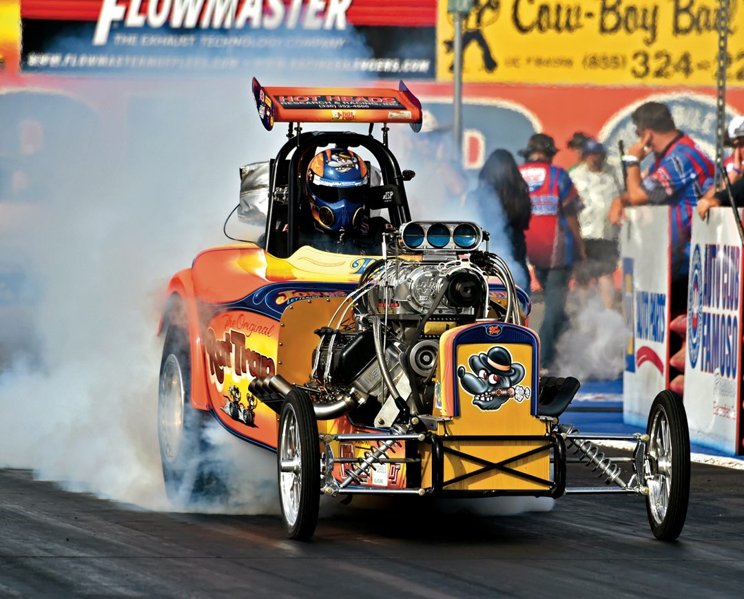 Rat Trap Fuel Altered heats its tires in a classic burnout.Photo: Howard Koby