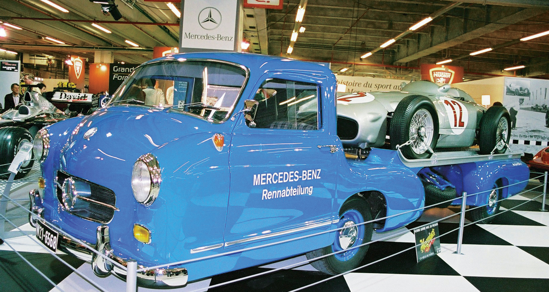 Intriguing Mercedes team transporter with W196R. Photo: Thierry Lesparre