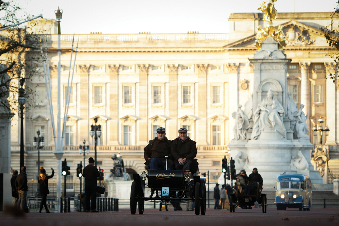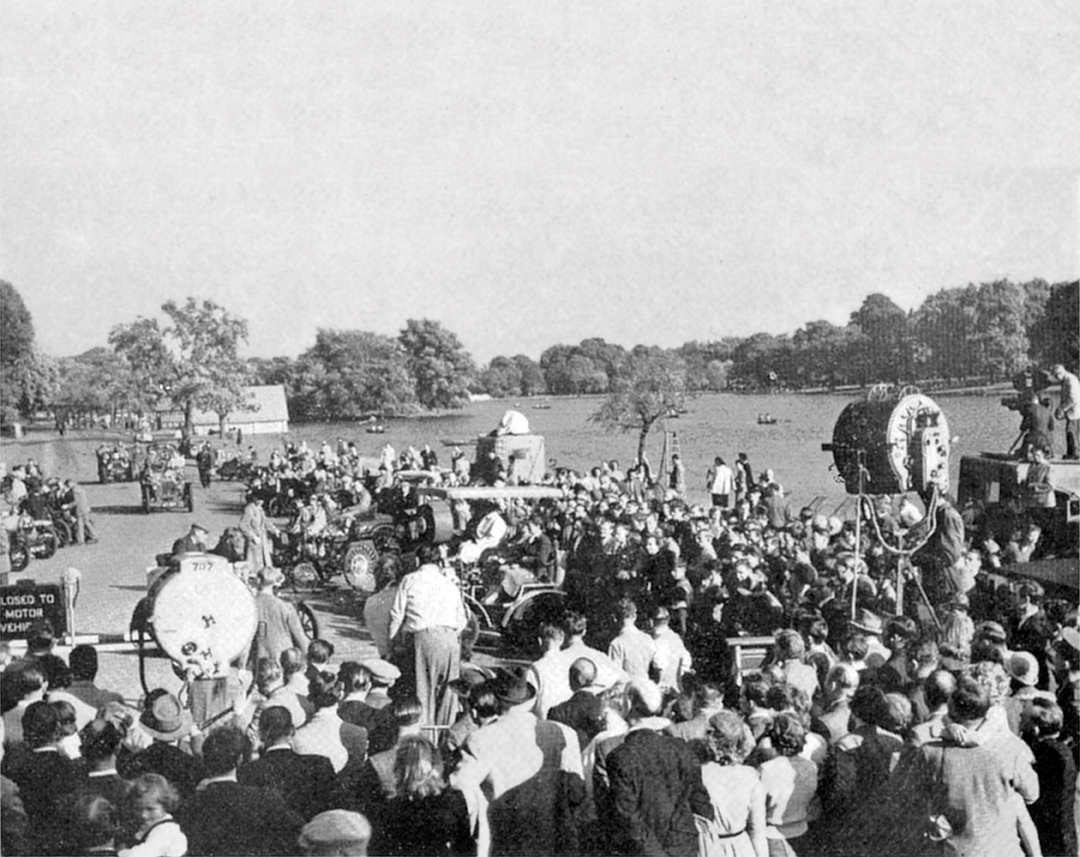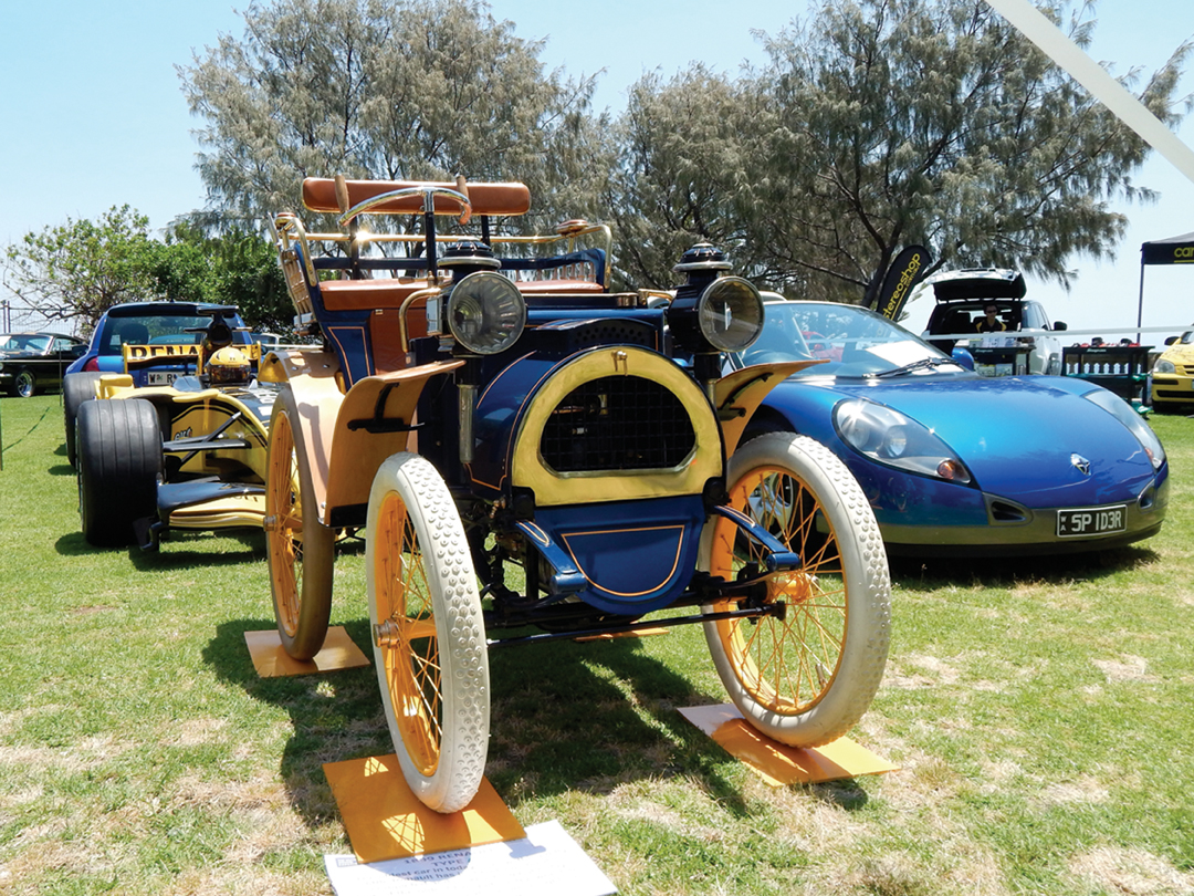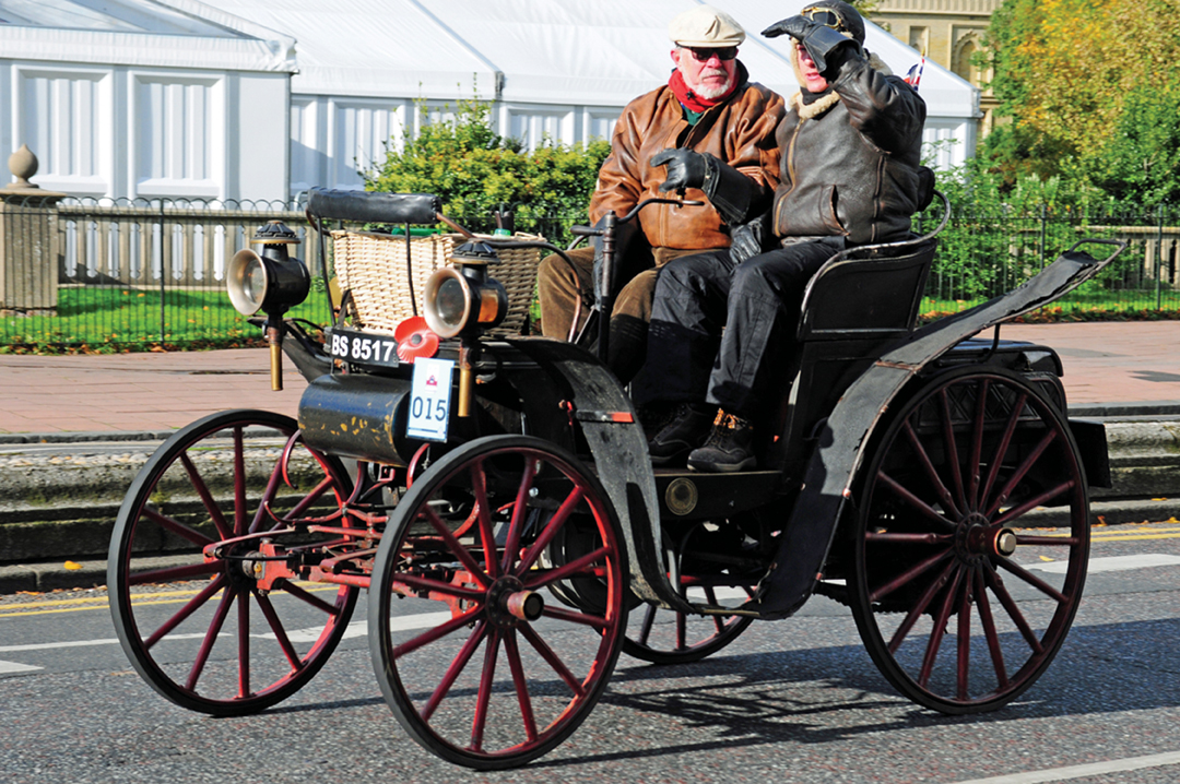 One of the oldest cars, an 1897 Bergman, passes the Pavilion