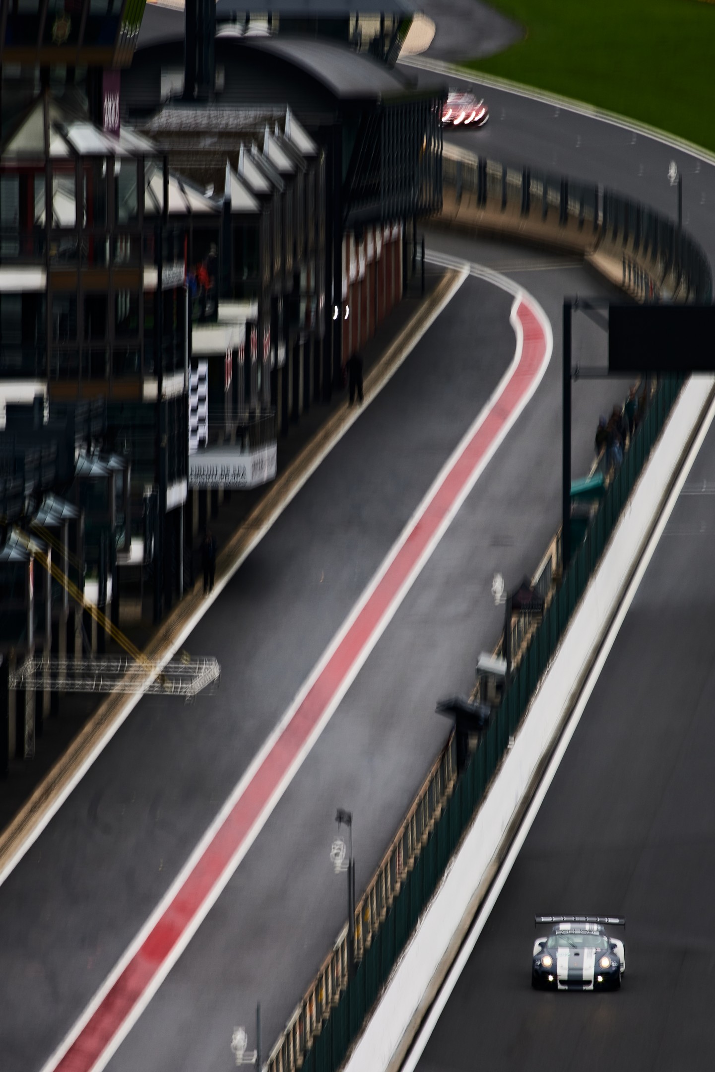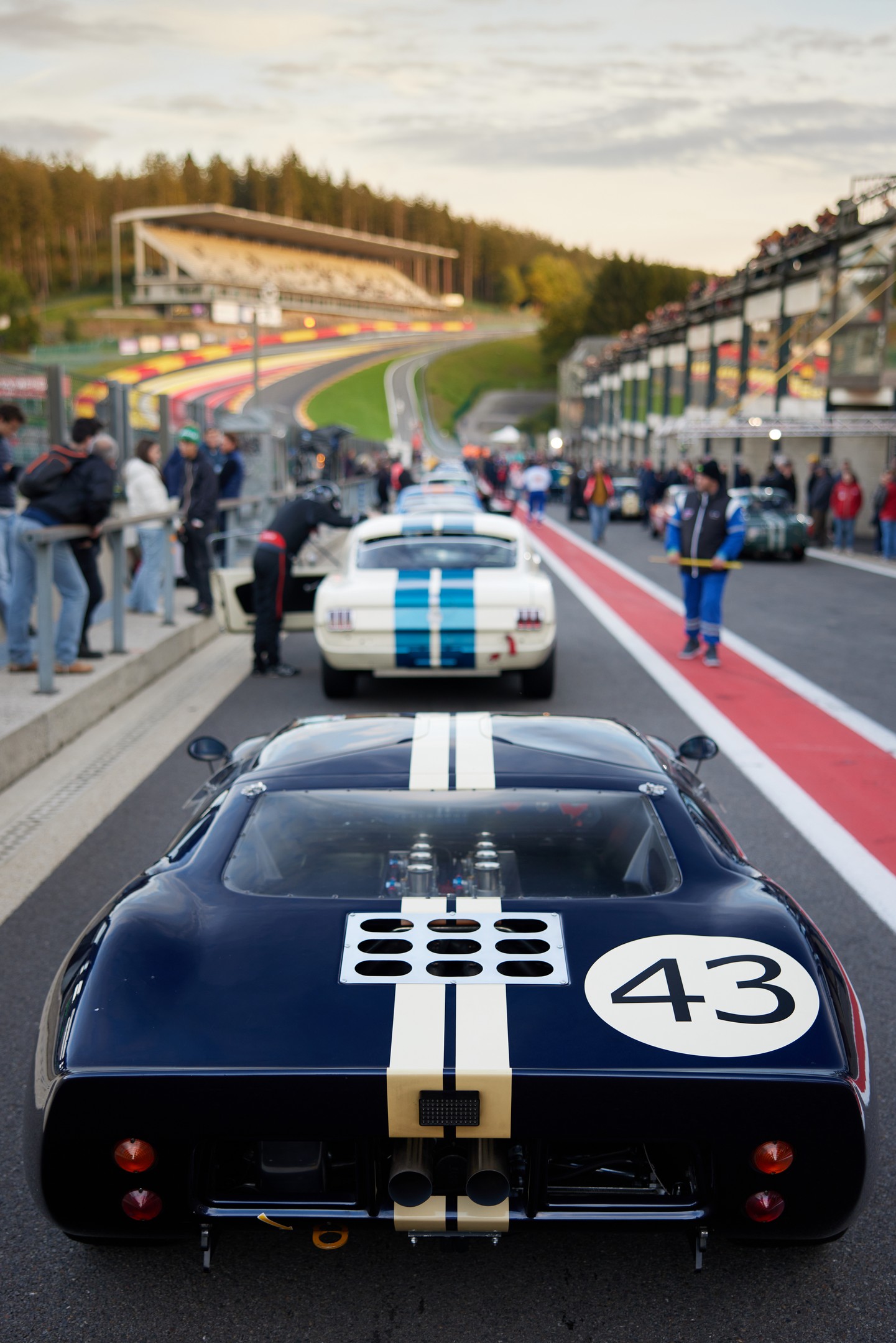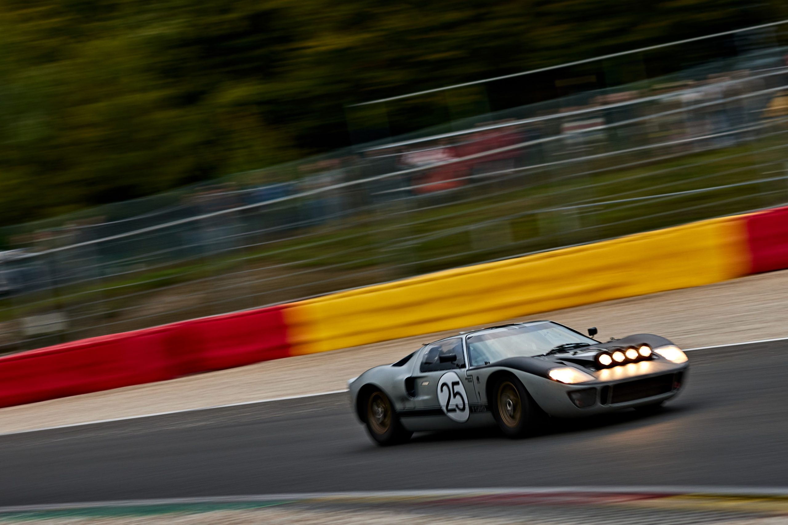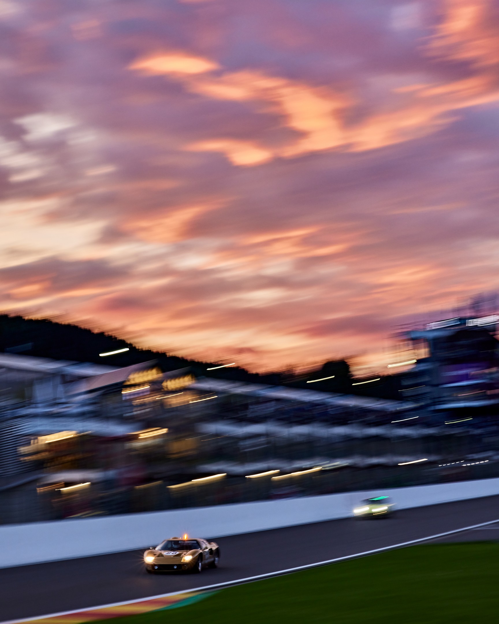 As the lights turned green, stood on the outside of Turn 1, a more formidable racing vista would be difficult to conceive. A pack of aggressive Ford GT40s headed towards La Source, the impossibly tight initial corner, leading the almost 80 car deep grid into six hours of combat on the asphalt. Contact at the first corner in the leading pack seemed almost inevitable, sure enough, one GT40 was turned around, and the safety car was brought out to bunch the pack up once more.