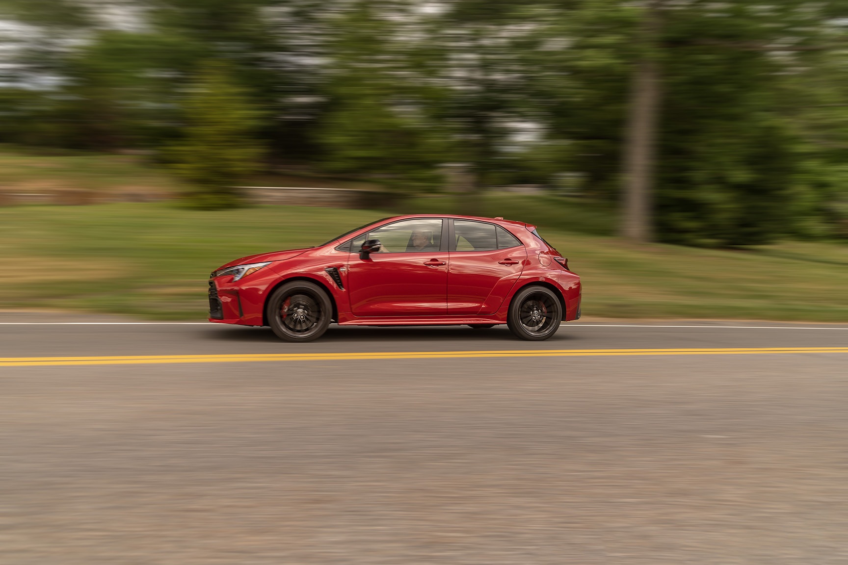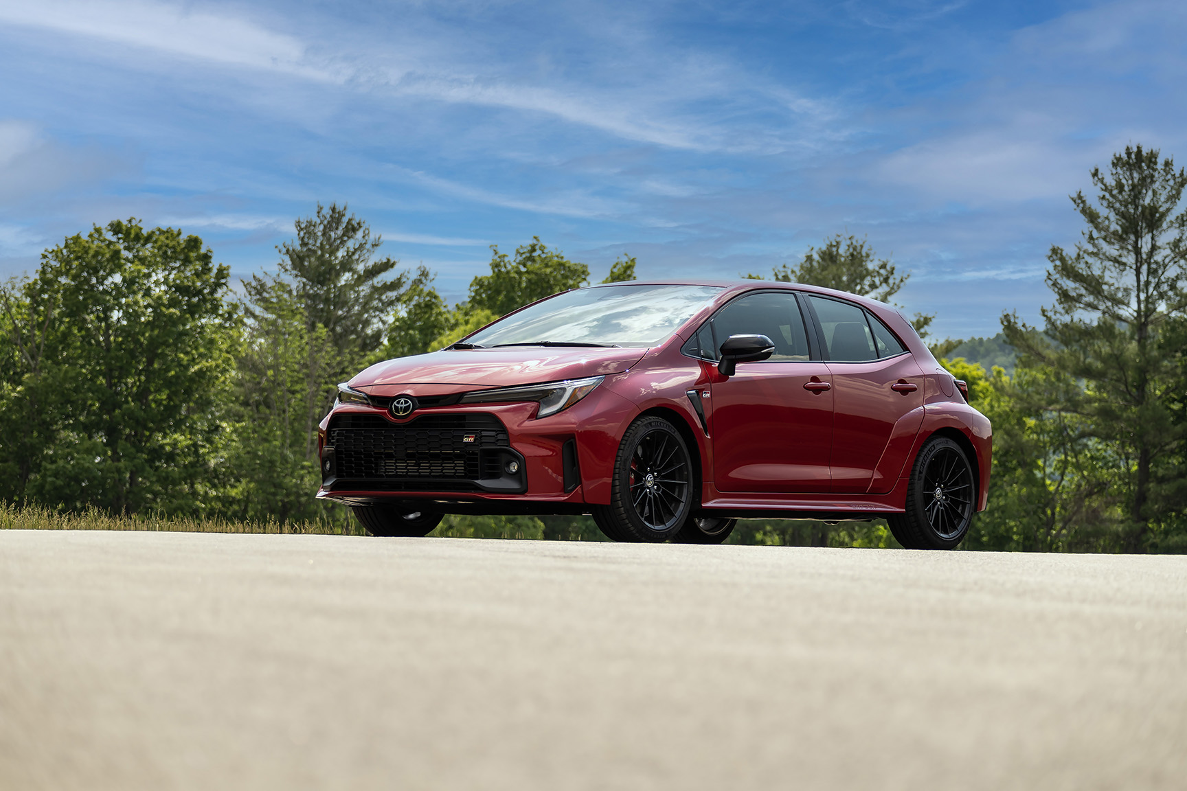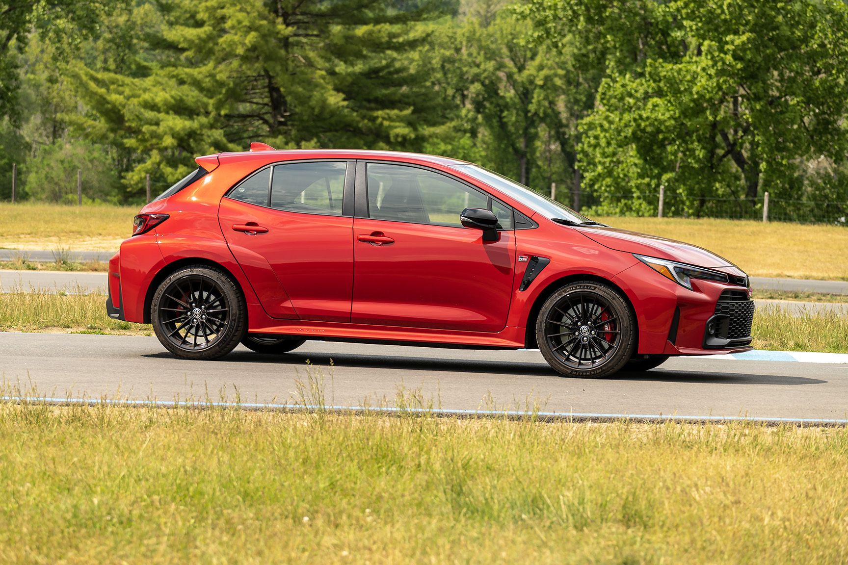 But putting the initials GR ( for Gazoo Racing) in front of Corolla is a completely different story. In doing so, Toyota has whipped up for the American market a whole new batch of badassery. Sure, there is the GR86 and the SupBMWra, but this hot hatch is something special. Here are a few stats to mull over. GR-FOUR All-wheel drive, 1.6 liter in-line 3-cylinder turbocharged engine putting out 300 HP @6500 rpm with 273 ft-lb of torque between 3000- 5500 rpm, a six-speed stick, MacPherson type front struts and double wishbone type multilink rears, front and rear Torsen limited slip differentials, and 18-inch 15-spoke cast-alloy wheels shod in Michelin Pilot Sport 4 tires. This takes the GR from 0-60 in 4.99 seconds with an electronically controlled top speed of 142.9 mph. 14 inch four-piston front calipers and 11.2 inch two-piston rear calipers with ventilated and slotted brake rotors, with a brake peddle that is very easy to modulate, are used to slow it down.