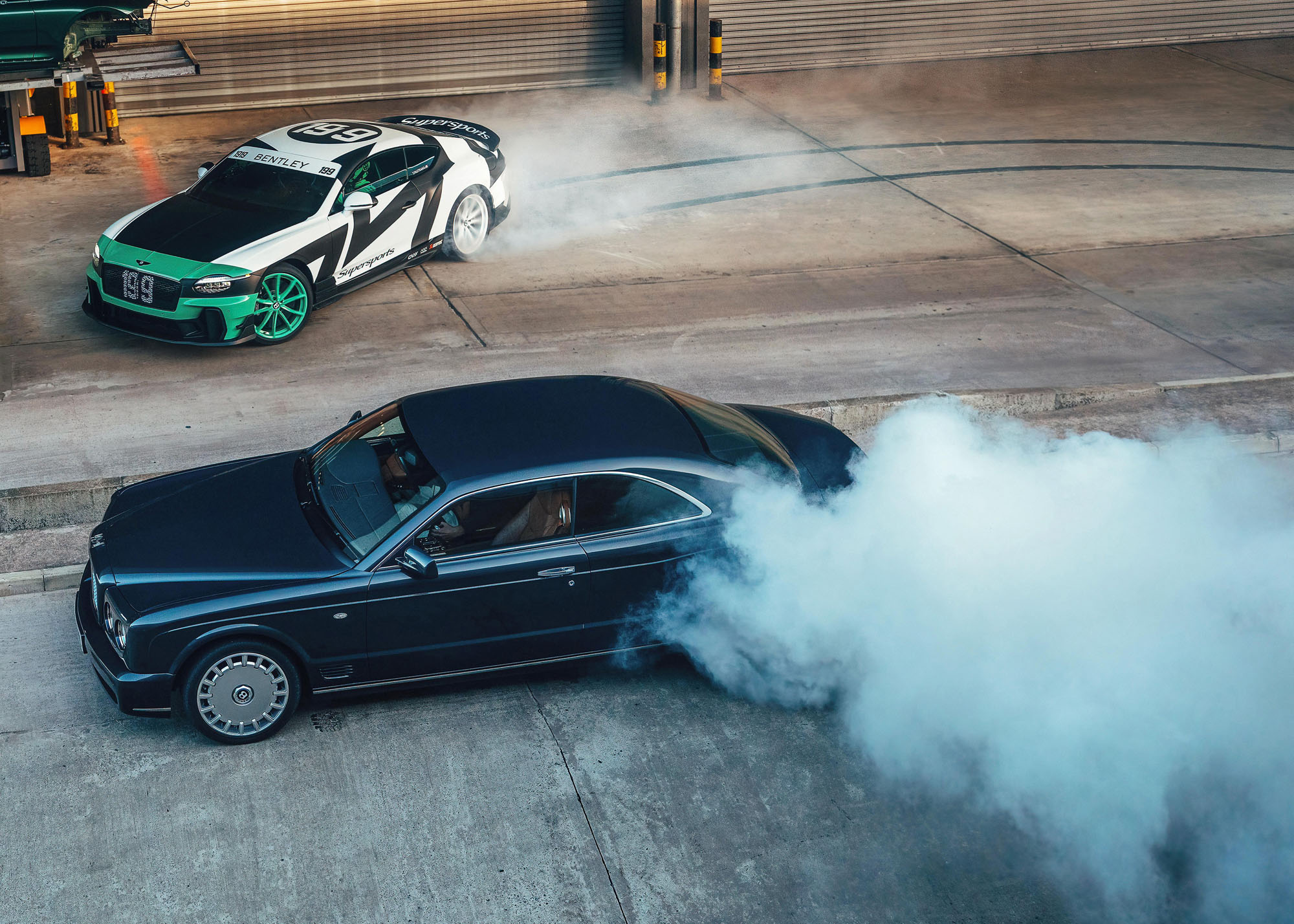 The final production Brooklands from 2010, also a member of the Heritage Collection, is seen using the last millimeters of rubber from its replacement rear tires, providing a dramatic, smoky backdrop for a huge Pastrana power slide. Finally, Pastrana comes to a stop in front of Bentley’s brand new, state-of-the-art Paint Shop, where all three previous generations of Supersports await him – two contemporary examples from the Heritage Collection, and a 1925 3 Litre Supersports (one of the original 18) borrowed from Vintage Bentley.