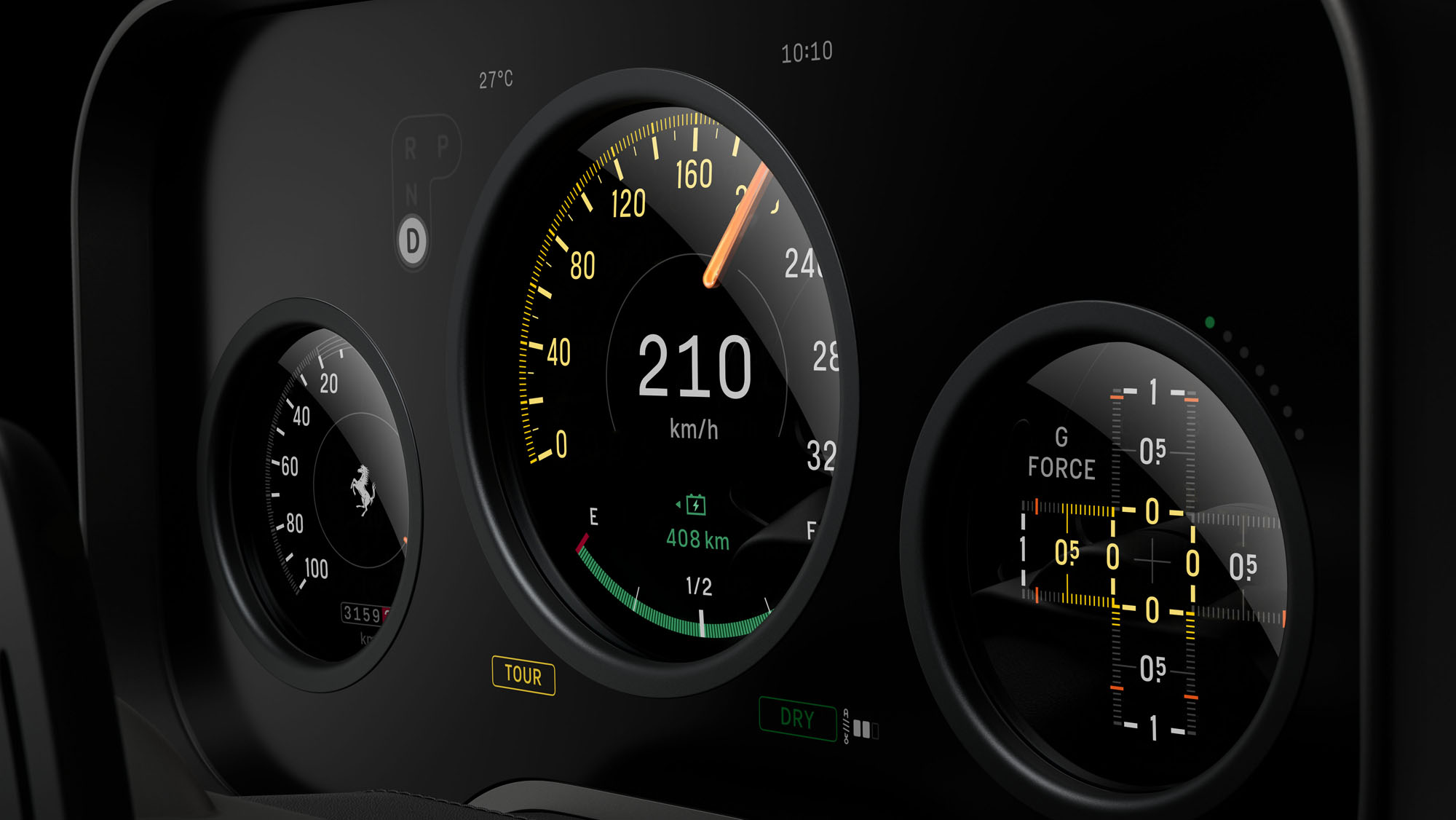 Three displays — driver binnacle, control panel, and rear control panel — are designed for clarity and intuitive navigation. A custom typeface ties the interface together, drawing inspiration from historic Ferrari and Italian engineering lettering.