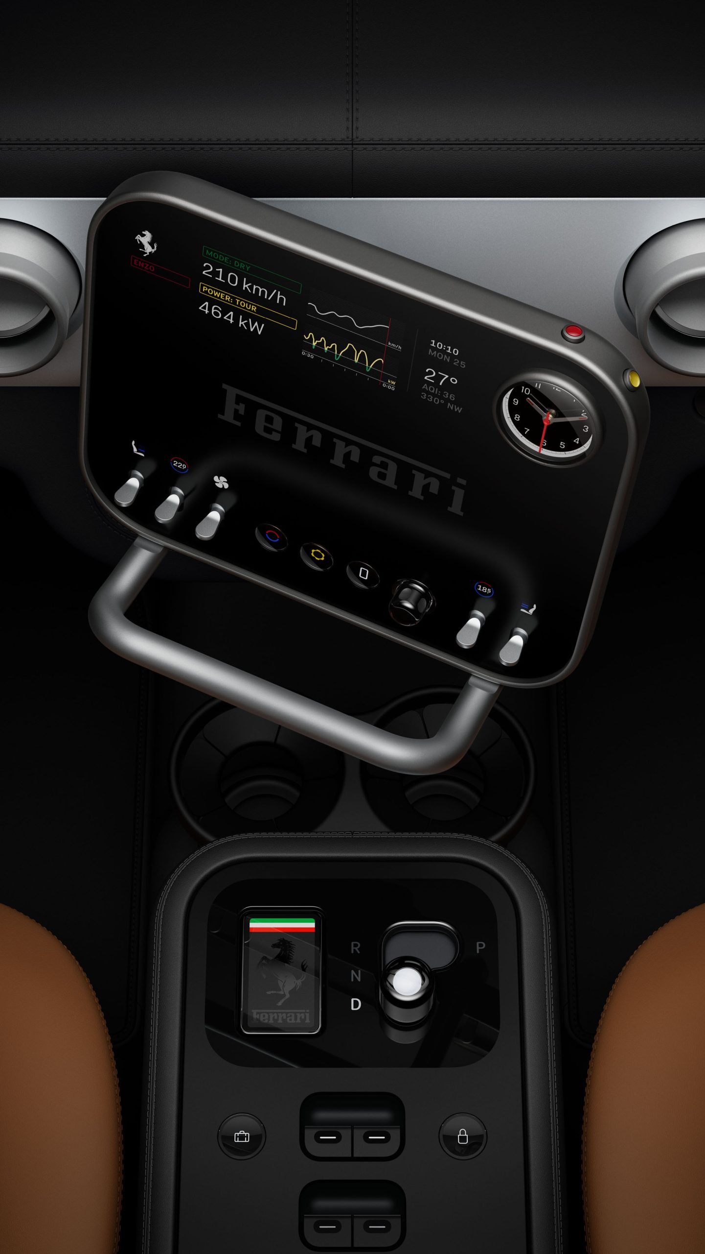 Developed alongside Ferrari’s Styling Centre, the interior expresses innovation through craftsmanship. The cabin is conceived as a single, calm volume, with hardware and software developed together so controls and displays feel unified and intuitive. Every component is purposefully designed to enhance the emotional thrill of driving.