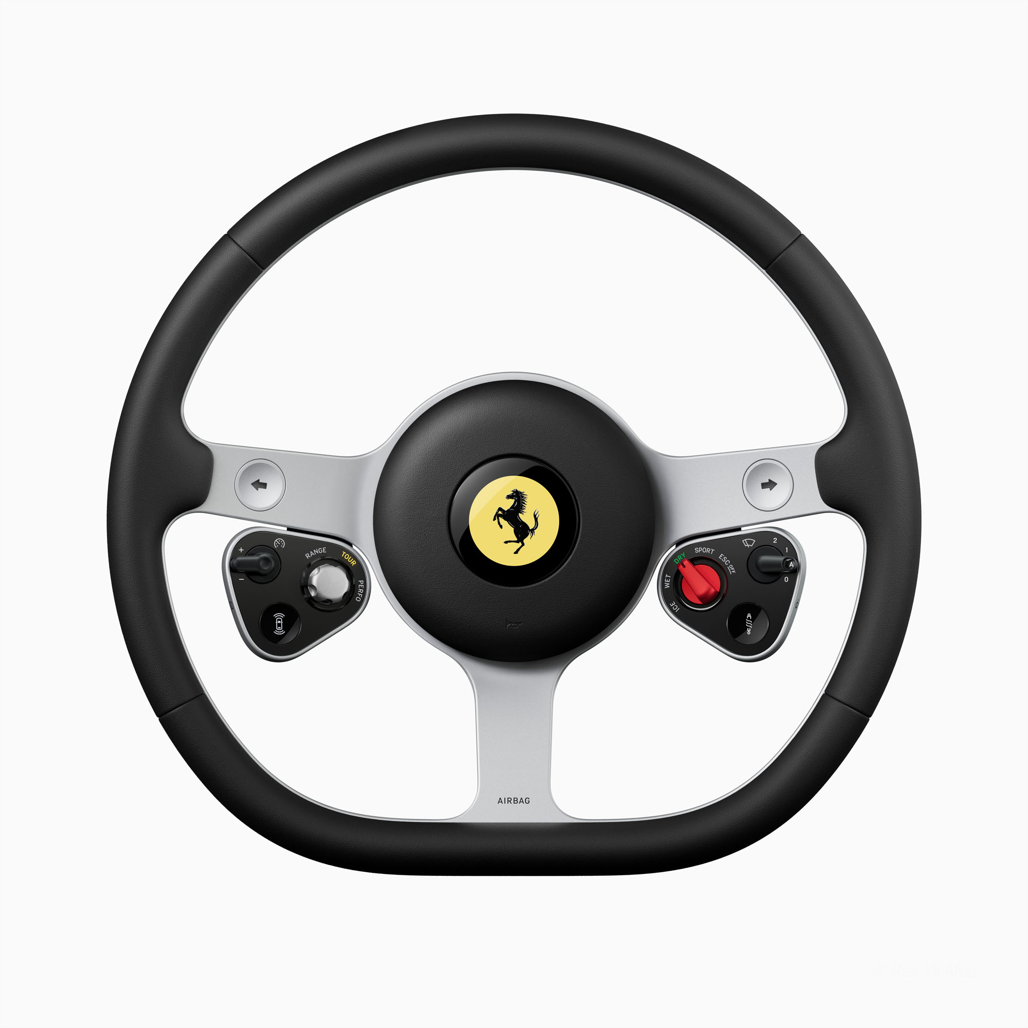 The simplified three-spoke steering wheel reinterprets Ferrari’s classic wooden designs with exposed aluminum spokes. Made from 100% recycled aluminum, it consists of 19 CNC-machined parts and weighs 400 grams less than a standard Ferrari wheel.
